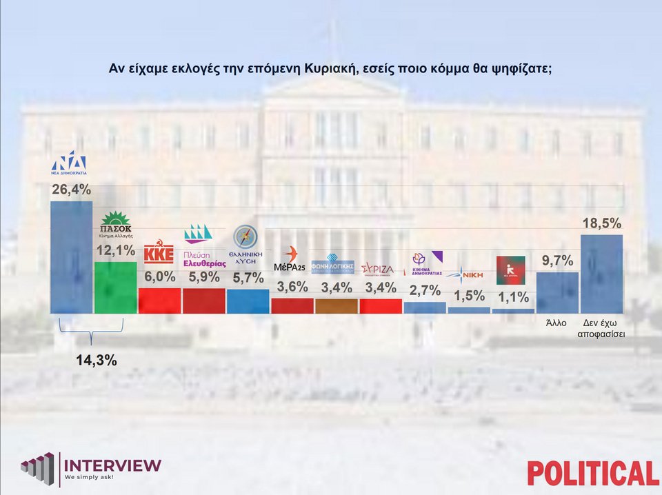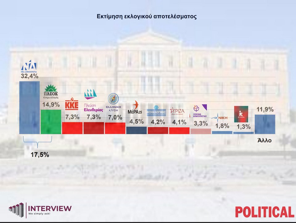 Δημοσκόπηση Interview: Στο 23,9% η ΝΔ, δεύτερο το κόμμα Καρυστιανού - Μάχη ΠΑΣΟΚ και Τσίπρα για την 3η θέση