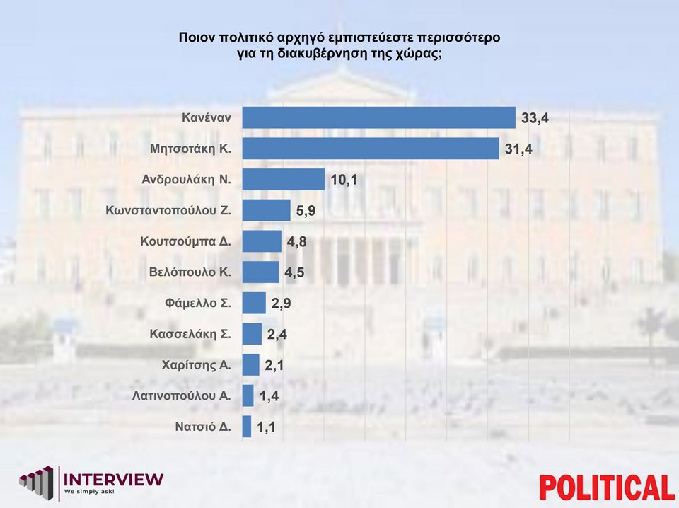 Στην ερώτηση ποιον πολιτικό αρχηγό εμπιστεύεστε περισσότερο για τη διακυβέρνηση της χώρας, Κανέναν επέλεξε το 33,4% και ακολουθούν ο Κυριάκος Μητσοτάκης με 31,4%, ο Νίκος Ανδρουλάκης με 10,1%, η Ζωή Κωνσταντοπούλου με 5,9%, ο Δημήτρης Κουτσούμπας με 4,8%, ο Κυριάκος Βελόπουλος με 4,5% ο Σωκράτης Φάμελλος με 2,9% ο Στέφανος Κασσελάκης με 2,4% ο Αλέξης Χαρίτσης με 2,1% η Αφροδίτη Λατινοπούλου με 1,4% και ο Δημήτρης Νατσιός με 1,1%.