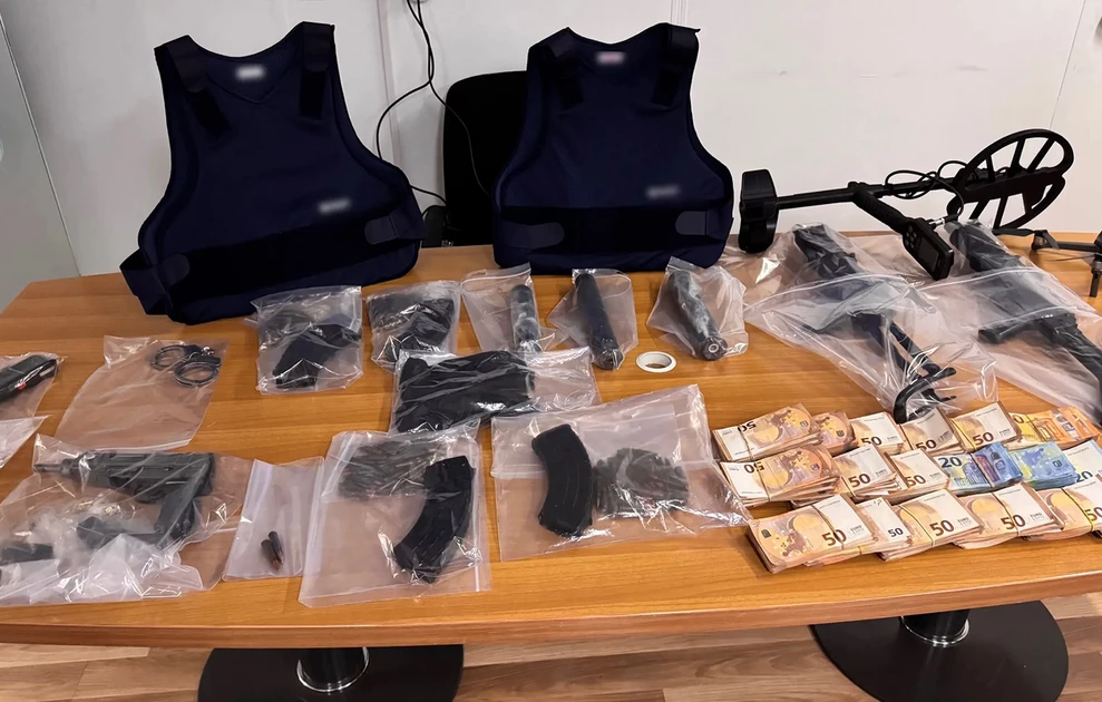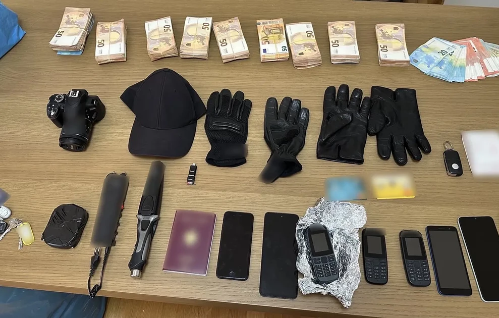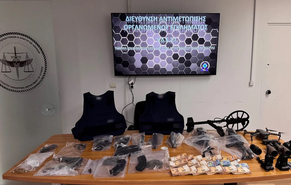 Από τις έρευνες που πραγματοποιήθηκαν σε οικίες, συνολικά βρέθηκαν και κατασχέθηκαν: πυροβόλο όπλο, δύο πολεμικά τυφέκια τύπου «KALASHNIKOV», δύο αλεξίσφαιρα γιλέκα, 118 φυσίγγια, 6 γεμιστήρες, 3 σιγαστήρες, χειροπέδες, 3 μαχαίρια, συσκευή ηλεκτρικής εκκένωσης (TASER), φορητή συσκευή γεωγραφικού εντοπισμού (GPS), 6 γραμμ. ακατέργαστης κάνναβης, πλήθος κινητών και καρτών SIM, συσκευή drone, κιάλια, 5 οχήματα, κλειδί αυτοκινήτου και 79.500 ευρώ σε μετρητά.
