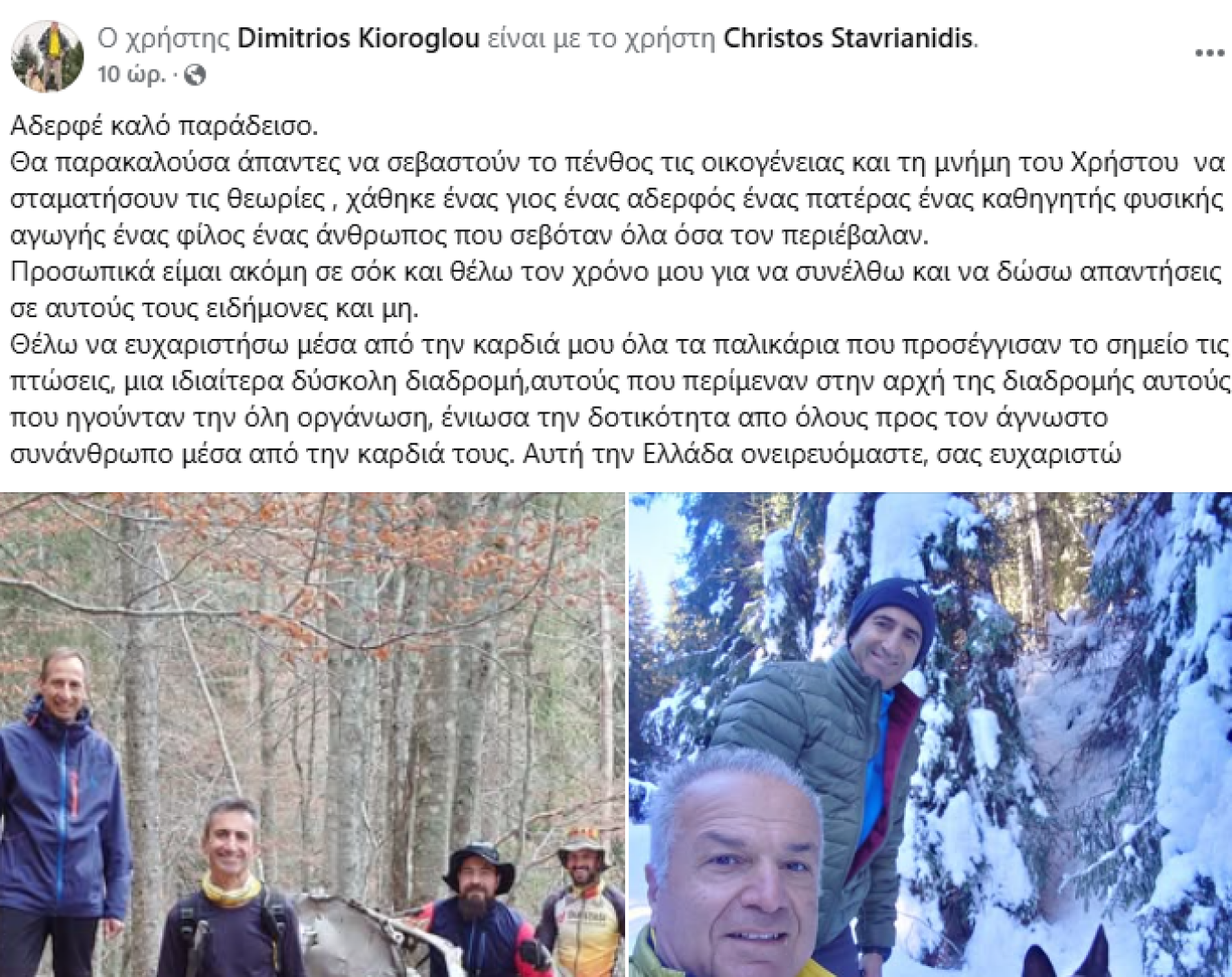 Με ένα συγκινητικό μήνυμα αποχαιρέτησε τον φίλο του Χρήστο που έχασε τη ζωή του στο βουνό της Δράμας ο Δημήτρης Κιορόγλου, ο άνθρωπος που ήταν μαζί του όταν, όπως έχει περιγράψει, τους επιτέθηκε μια αρκούδα, η οποία, κατά τα λεγόμενά του, ήταν αυτή που έριξε τον άτυχο ορειβάτη στη χαράδρα όπου βρέθηκε χωρίς τις αισθήσεις του.