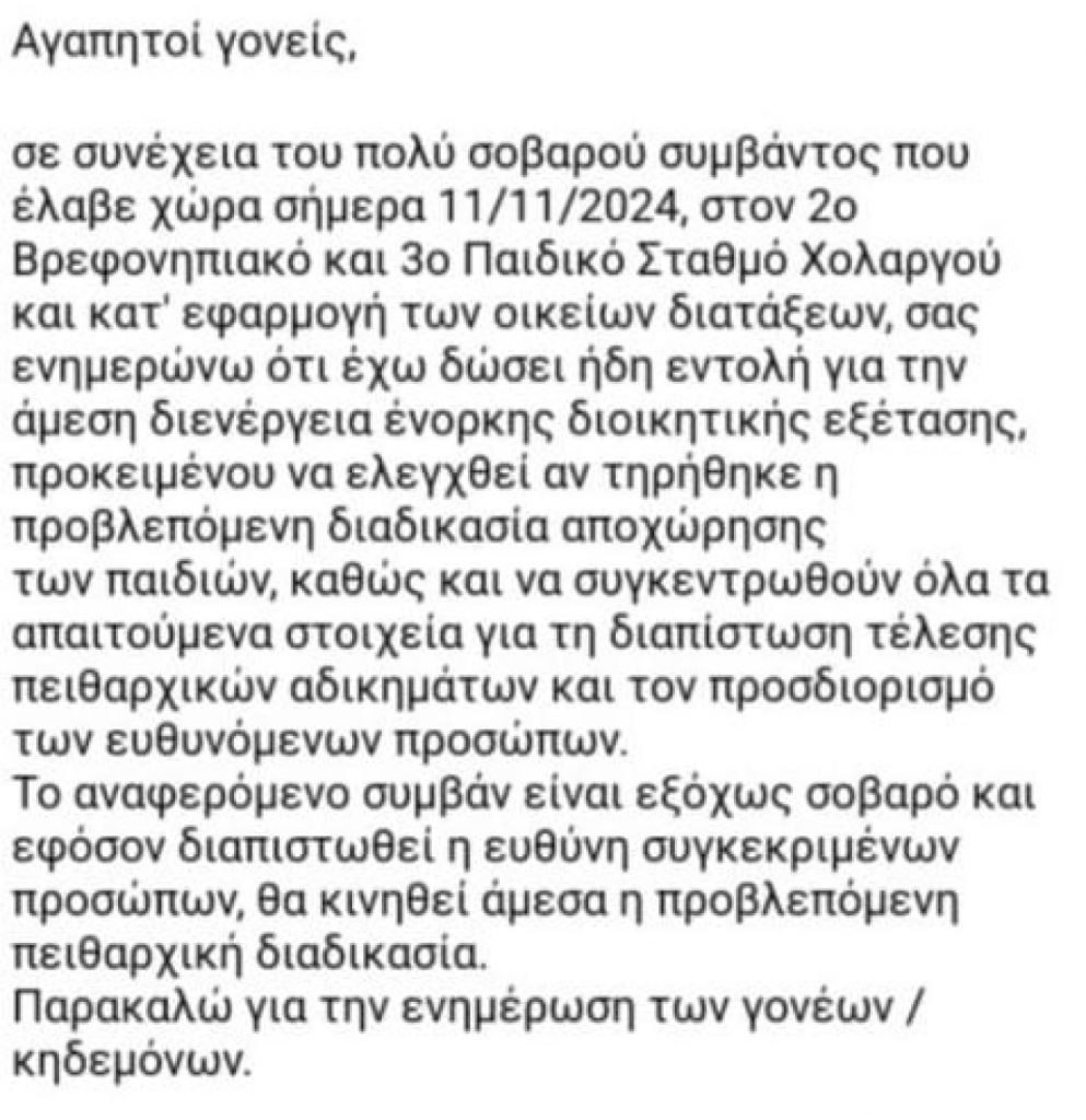 Θα ελεγχθεί αν τηρήθηκε η προβλεπόμενη διαδικασία αποχώρησης των παιδιών