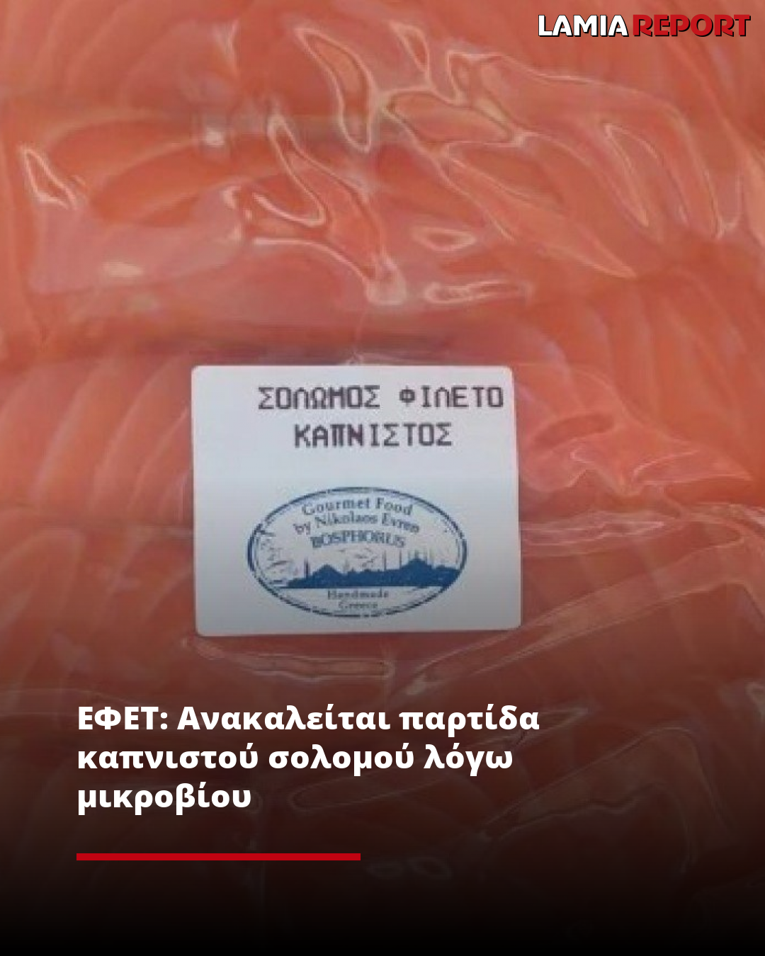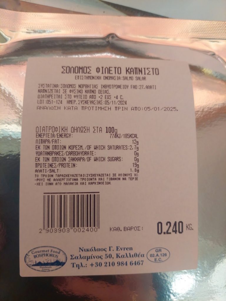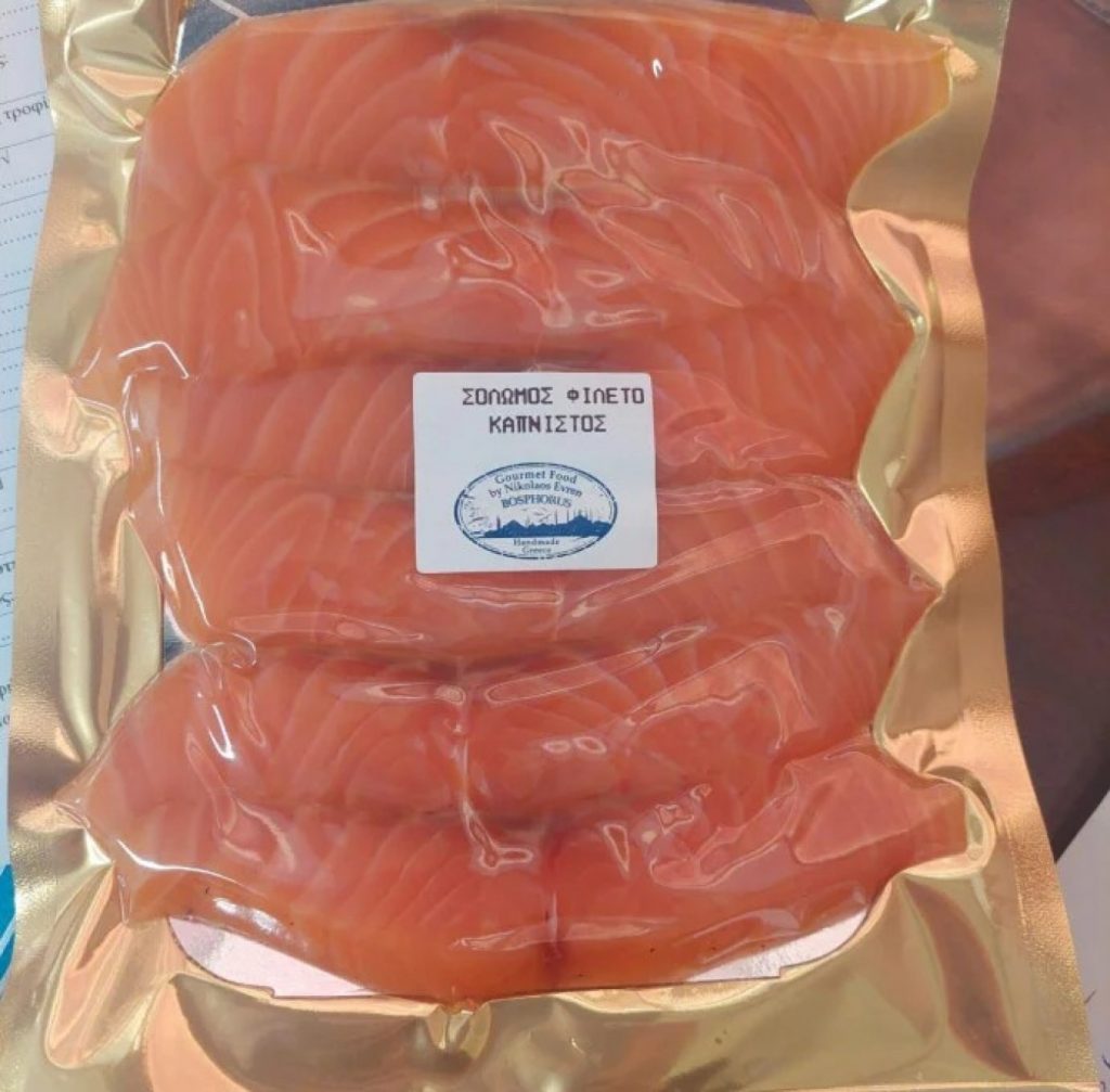 Πρόκειται για καπνιστό σολομό φιλέτο με την εμπορική ονομασία «GOURMET FOOD BOSRHOROUS», το οποίο διακινείται στην Ελλάδα σε συσκευασίες των 240 γρ, από την επιχείρηση «Νικόλαος Γ. Evren» (Σαλαμίνος 50, Καλλιθέα Αττικής).
