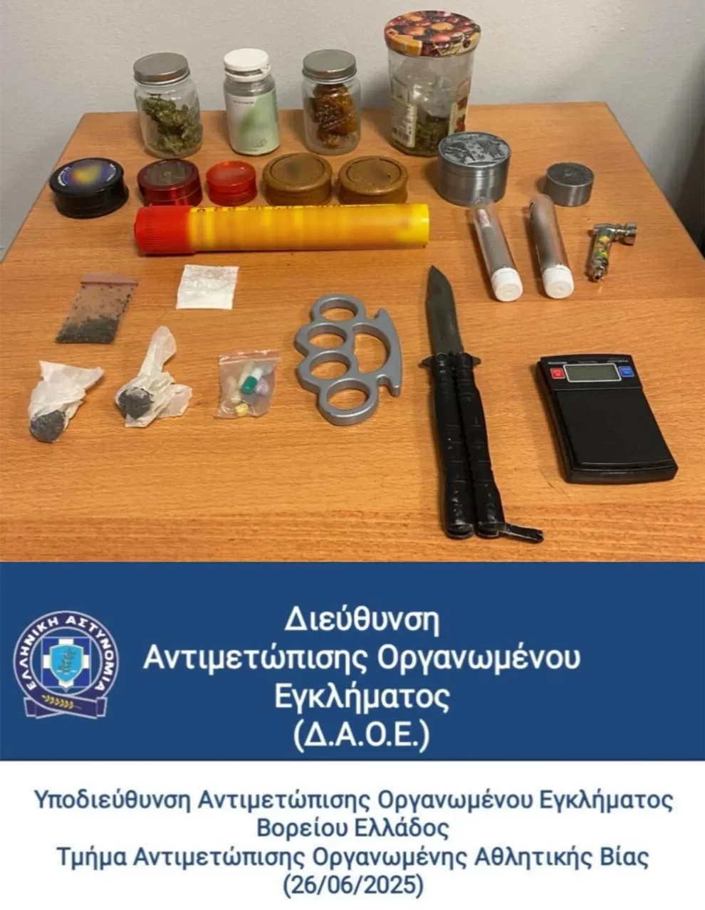 Συνολικά κατασχέθηκαν μικροποσότητες κατεργασμένης κάνναβης σε μορφή «σοκολάτας», ακατέργαστη κάνναβη, ναρκωτική ουσία (CHAGA και DMT CHAGA), ναρκωτικά χάπια (ecstasy, MDMA), δύο παραισθησιογόνα μανιτάρια, μία ηλεκτρονική ζυγαριά, μη ενεργοποιημένος ναυτικός πυρσός, σουγιάς, σιδερογροθιά κ.ά.