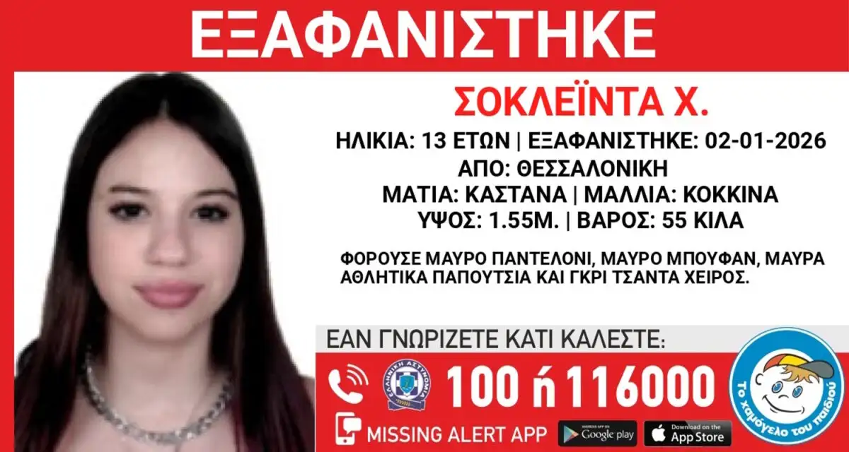 Σύμφωνα με το «Χαμόγελο του Παιδιού» στις 02/01/2026, βραδινές ώρες, εξαφανίστηκε από χώρο φιλοξενίας στη Θεσσαλονίκη η ανήλικη Σοκλέϊντα Χ., 13 ετών.