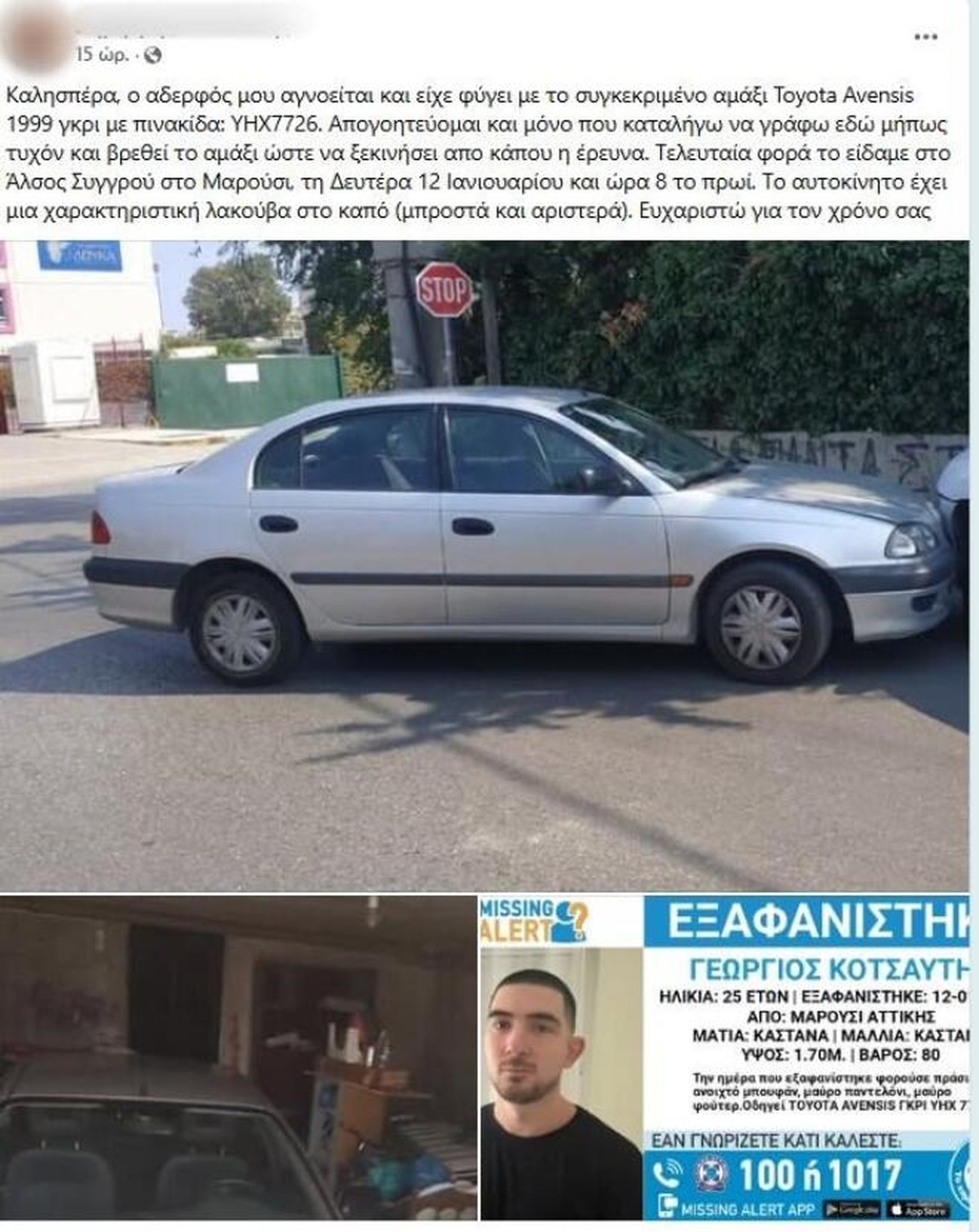 Σε αυτήν αναφέρει: "Ο αδερφός μου αγνοείται και είχε φύγει με το συγκεκριμένο αμάξι Toyota Avensis 1999 γκρι με πινακίδα: ΥΗΧ7726. Απογοητεύομαι και μόνο που καταλήγω να γράφω εδώ, μήπως τυχόν και βρεθεί το αμάξι, ώστε να ξεκινήσει από κάπου η έρευνα. Τελευταία φορά το είδαμε στο Άλσος Συγγρού στο Μαρούσι, τη Δευτέρα 12 Ιανουαρίου και ώρα 8 το πρωί. Το αυτοκίνητο έχει μια χαρακτηριστική λακούβα στο καπό (μπροστά και αριστερά). Ευχαριστώ για τον χρόνο σας".