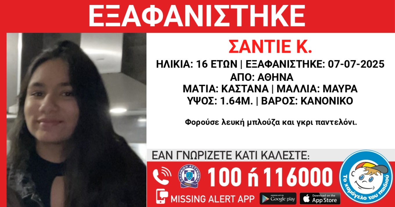 Εξαφανίστηκε το απόγευμα της Δευτέρας 7 Ιουλίου από χώρο φιλοξενίας στην Αθήνα, η Σαντιέ Κ., 16 ετών.