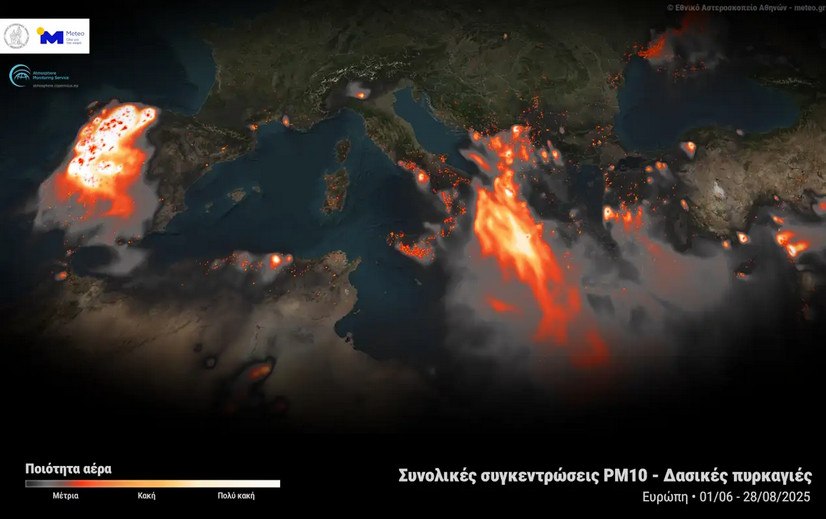 Όπως φαίνεται στην Εικόνα, οι υψηλότερες συγκεντρώσεις αιωρούμενων σωματιδίων PM₁₀ (σωματίδια με διάμετρο μικρότερη των 10 μικρομέτρων), τα οποία συνδέονται με τις δασικές πυρκαγιές, καταγράφηκαν στην Ισπανία, την Πορτογαλία και τον ελλαδικό χώρο. Οι εκτεταμένες πυρκαγιές που ξέσπασαν φέτος συνέβαλαν καθοριστικά στην επιβάρυνση της ατμόσφαιρας, αυξάνοντας τον κίνδυνο για τη δημόσια υγεία.