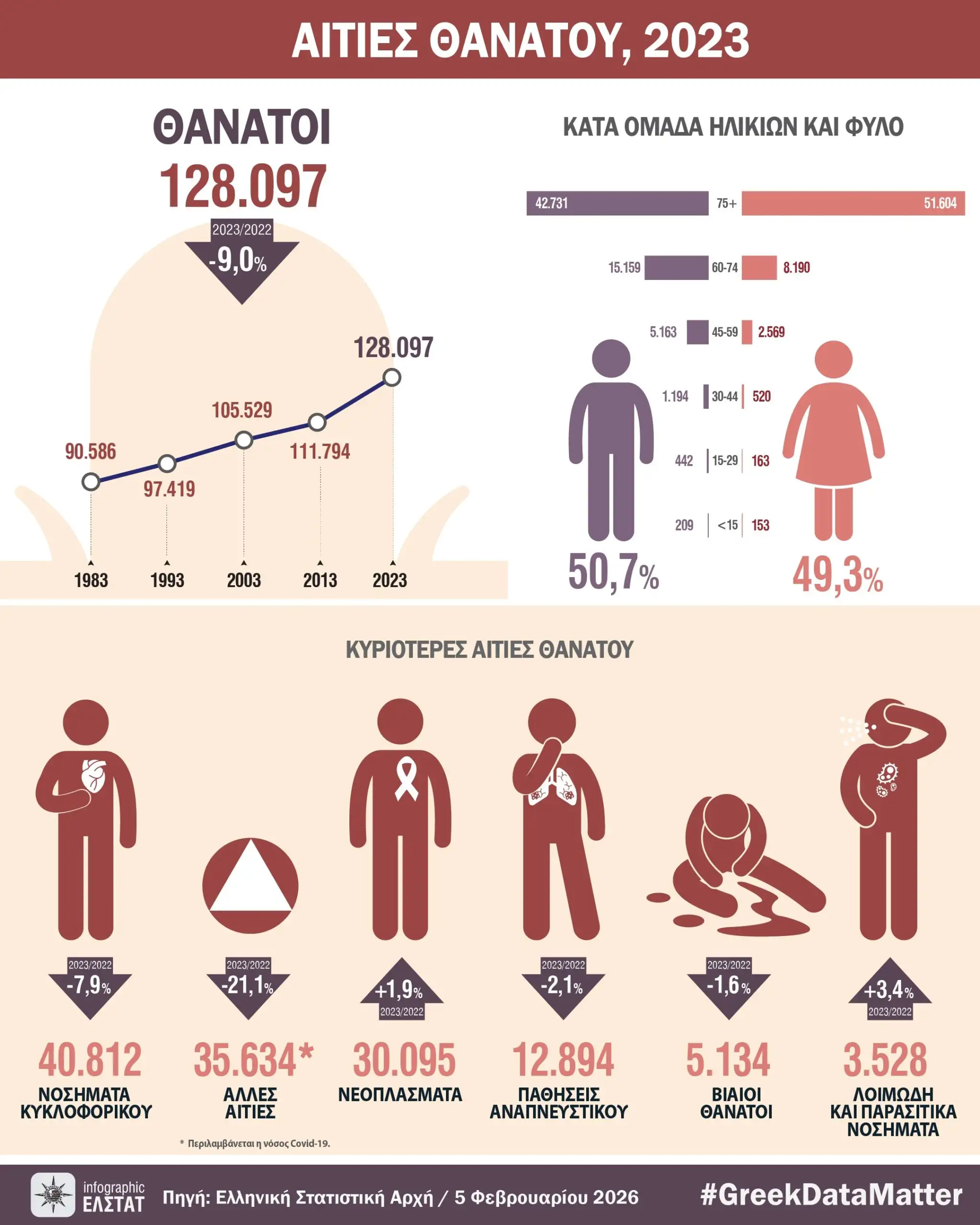 Σύμφωνα με τα οριστικά στοιχεία της ΕΛΣΤΑΤ, οι θάνατοι ανήλθαν σε 128.097, έναντι των 140.792 που είχαν σημειωθεί το 2022. Η πτώση αυτή αποδίδεται σε μεγάλο βαθμό στην κατακόρυφη υποχώρηση των θανάτων από τη νόσο COVID-19, οι οποίοι περιορίστηκαν σε 5.975 το 2023, σημειώνοντας μείωση της τάξης του 63% σε σύγκριση με τους 16.173 θανάτους του 2022.