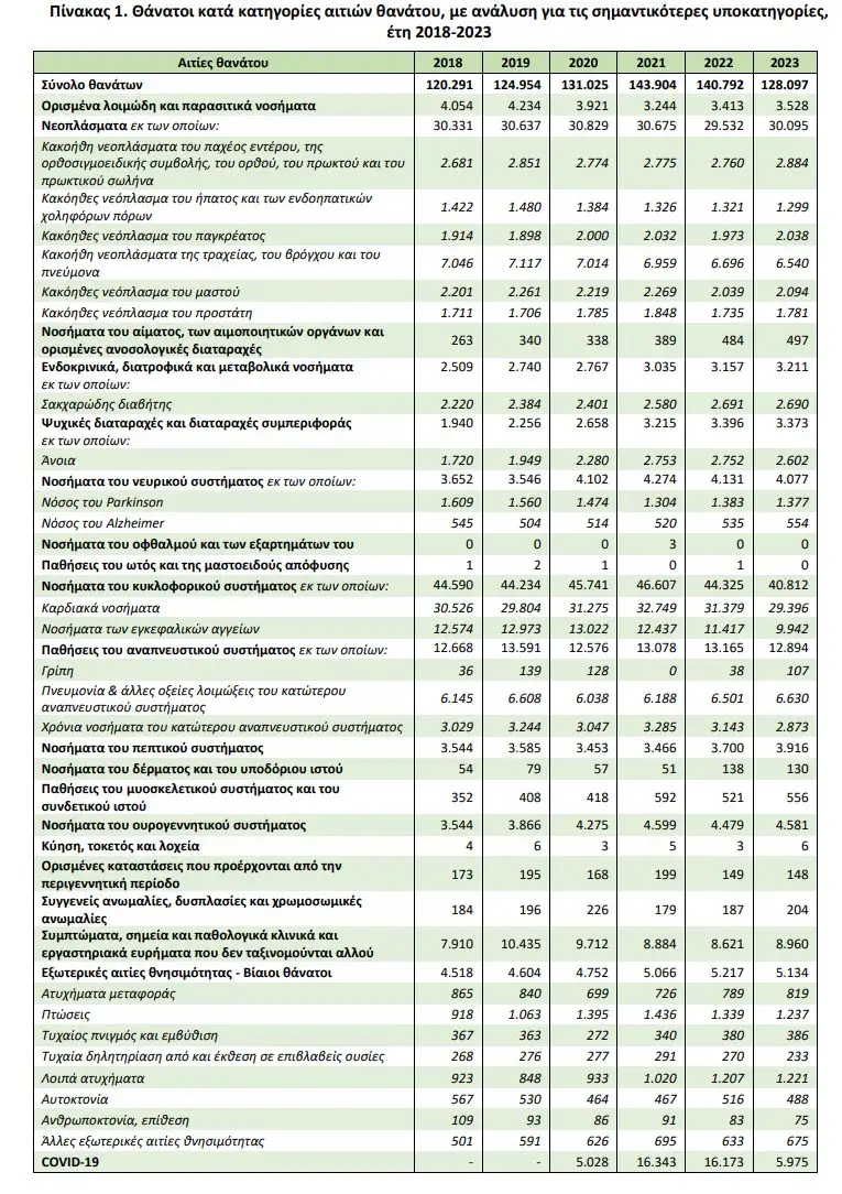 Κυρίαρχες αιτίες θανάτου παραμένουν τα νοσήματα του κυκλοφορικού συστήματος με 40.812 θανάτους, ακολουθούμενα από τα νεοπλάσματα (30.095) και τις παθήσεις του αναπνευστικού (12.894).