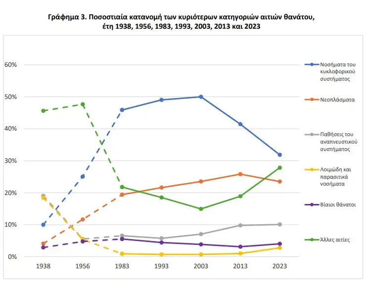 «Το ποσοστό θανάτων από νοσήματα του κυκλοφορικού συστήματος στο σύνολο των θανάτων, από 10,0% που ήταν το 1938 […] ανήλθε σε 31,9% το 2023.