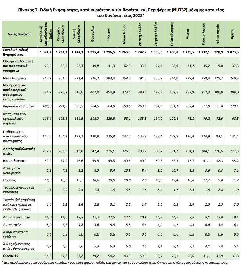 Η ανάλυση ανά Περιφέρεια δείχνει ότι η Πελοπόννησος παρουσιάζει την υψηλότερη συνολική ειδική θνησιμότητα (1.480,0 ανά 100.000 κατοίκους), ενώ η Περιφέρεια Νοτίου Αιγαίου τη χαμηλότερη (928,9).