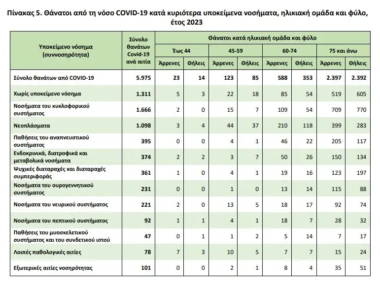 Ως προς τα ηλικιακά – δημογραφικά στοιχεία από την έκθεση του 2023 προκύπτει πώς η συντριπτική πλειονότητα των θανάτων (94.335) αφορά την ηλικιακή ομάδα 75 ετών και άνω.