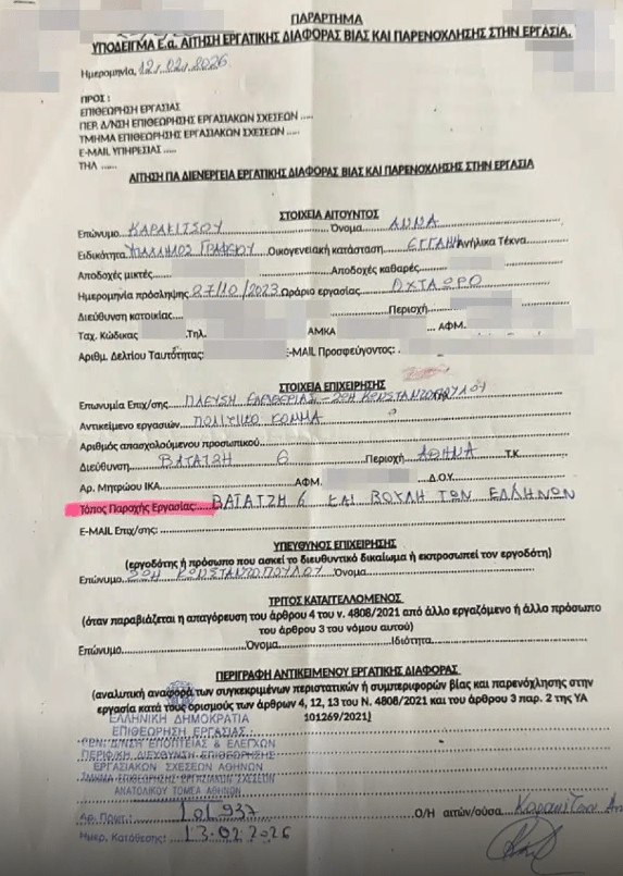 Η ίδια προχώρησε σε επίσημη καταγγελία στην Επιθεώρηση Εργασίας, ζητώντας τη λύση της σύμβασής της.