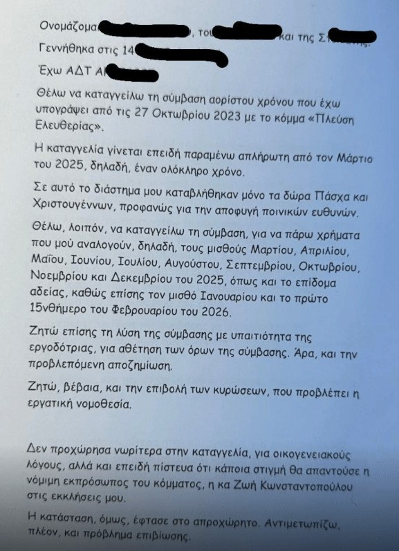 Θα μπορούσα να απαριθμήσω και άλλα περιστατικά. Από κάποιο χρονικό διάστημα κι έπειτα, κάθε μέρα συνεργασίας με την κα Ζωή Κωνσταντοπούλου ήταν προβληματική, ίσως και τοξική. Λες και επηρεαζόταν από κάθε τι άλλο που συνέβαινε και ξεσπούσε στους συνεργάτες της, με χαρακτηρισμούς που μας τάραζαν την ψυχολογία και την όποια καλή διάθεση είχαμε. Για όλους αυτούς τους λόγους, λοιπόν, αλλά και για την οικονομική ασυνέπεια της εργοδότριας, καταγγέλλω τη σύμβαση εργασίας, αορίστου χρόνου που είχα με την Πλεύση Ελευθερίας».