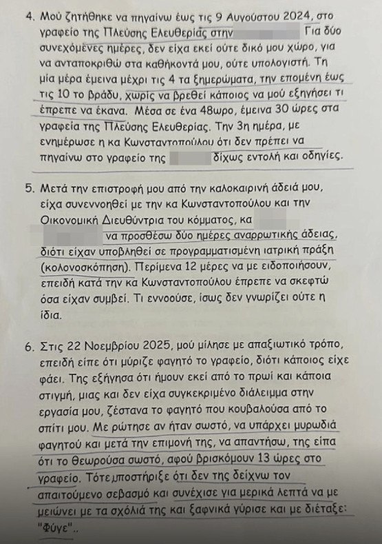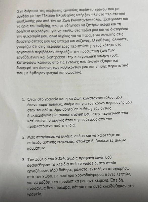 «Στη διάρκεια της σύμβασης εργασίας αορίστου χρόνου που με συνδέει με την Πλεύση Ελευθερίας υπήρξαν πλείστα περιστατικά απαξίωσής μου από την κα Ζωή Κωνσταντοπούλου. Ξεπέρασαν και τα όρια του bullying, που με οδήγησαν να ζητήσω ακόμα και τη βοήθεια ψυχολόγου για να σταθώ στα πόδια μου και να διατηρήσω την ψυχραιμία μου, αλλά κυρίως για να παραμείνω συνεπής στις δραστηριότητές μου ως μητέρα και σύζυγος. Ο καθένας, άλλωστε, γνωρίζει ότι στις περισσότερες περιπτώσεις η τοξικότητα στο εργασιακό περιβάλλον επηρεάζει την προσωπική ζωή των εργαζομένων και διαταράσσει την οικογενειακή γαλήνη τους.