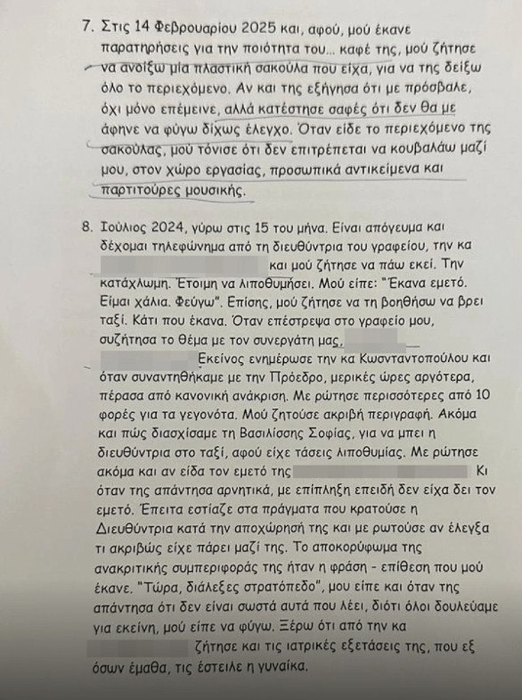 7. Στις 14 Φεβρουαρίου 2025, και αφού μου έκανε παρατηρήσεις για την ποιότητα του… καφέ της, μου ζήτησε να ανοίξω μία πλαστική σακούλα που είχα για να της δείξω όλο το περιεχόμενο. Αν και της εξήγησα ότι με προσβάλλει, όχι μόνο επέμεινε, αλλά κατέστησε σαφές ότι δεν θα με άφηνε να φύγω δίχως έλεγχο. Όταν είδε το περιεχόμενο της σακούλας, μου τόνισε ότι δεν επιτρέπεται να κουβαλάω μαζί μου, στον χώρο εργασίας, προσωπικά αντικείμενα και παρτιτούρες μουσικής.