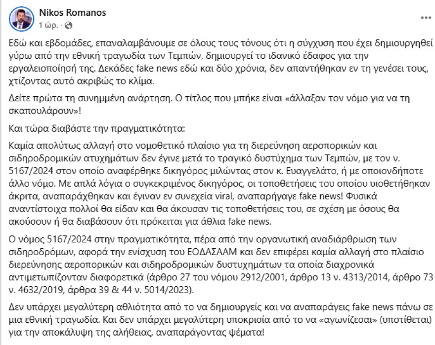 Fake news ότι αλλάξαμε τον νόμο για τη διερεύνηση σιδηροδρομικών και αεροπορικών δυστυχημάτων, λέει ο Ρωμανός