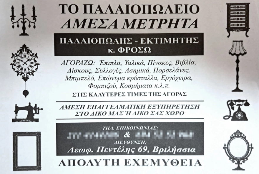 Με «βιτρίνα» το παλαιοπωλείο που η γυναίκα, 45 ετων, διατηρεί στην οδό Πεντέλης μοίραζαν φυλλάδια στην ευρύτερη περιοχή των βορείων προαστίων. Όπως αναφέρεται στο σχετικό φυλλάδιο η κυρία «Φροσω» με συνεργό τον 25χρονο γιο της, όταν δέχονταν τηλέφωνο από ενδιαφερόμενους μετέβαιναν στα σπίτια τους και με τη μέθοδο της παραπλάνησης αποσπούσαν μετρητά και κοσμήματα και έφευγαν ανενόχλητοι.