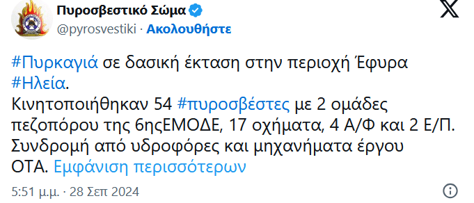 Συναγερμός έχει σημάνει στην Πυροσβεστική για φωτιά που ξέσπασε το απόγευμα του Σαββάτου σε δασική έκταση στην περιοχή Έφυρα στην Ηλεία.