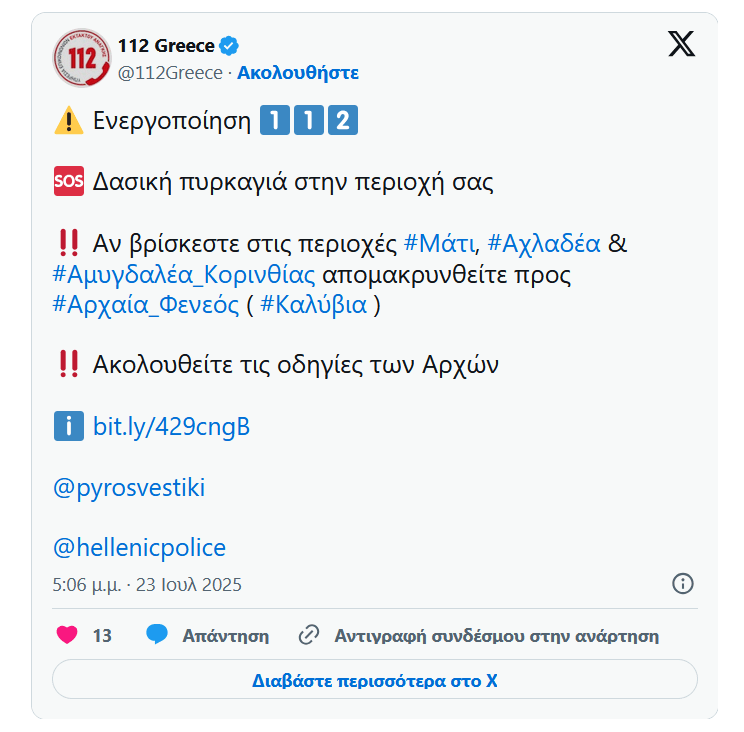 https://x.com/112Greece/status/1948022017938096386?ref_src=twsrc%5Etfw%7Ctwcamp%5Etweetembed%7Ctwterm%5E1948022017938096386%7Ctwgr%5Ed68bf60fc297301917c85adec65fa9501de384d5%7Ctwcon%5Es1_c10&ref_url=https%3A%2F%2Fwww.newsit.gr%2Fellada%2Ffotia-ston-feneo-dyo-pyrosvestes-sto-nosokomeio-o-enas-me-egkaymata-maxi-me-tis-anazopyroseis%2F4436963Ειδικότερα το μήνυμα αναφέρει: «Αν βρίσκεστε στις περιοχές Μάτι, Αχλαδέα και Αμυγδαλέα Κορινθίας απομακρυνθείτε προς Αρχαία Φενεός (Καλύβια). Ακολουθείτε τις οδηγίες των Αρχών».