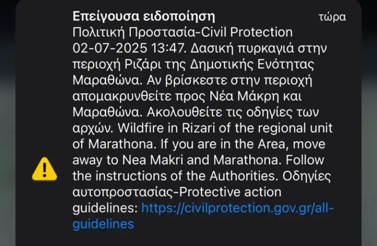 Προληπτικό μήνυμα από το 112 στάλθηκε στους κατοίκους του Μαραθώνα με σκοπό να εκκενώσουν.