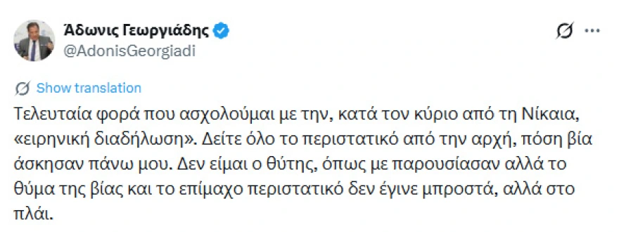 Για τα επεισόδια που σημειώθηκαν στο Γενικό Κρατικό Νίκαιας κατά την επίσκεψή του την περασμένη εβδομάδα, τα βίντεο που κυκλοφόρησαν, τη σύλληψη του γιατρού και όσα του καταλογίζουν για τις αναρτήσεις που έκανε στη συνέχεια, μίλησε το πρωί της Τρίτης ο υπουργός Υγείας, Άδωνις Γεωργιάδης, ο οποίος έδωσε στη δημοσιότητα και όλο το βίντεο από όσα συνέβησαν στο νοσοκομείο γράφοντας σε ανάρτησή του στο Χ ότι «δεν είμαι ο θύτης, όπως με παρουσίασαν αλλά το θύμα της βίας και το επίμαχο περιστατικό δεν έγινε μπροστά, αλλά στο πλάι».