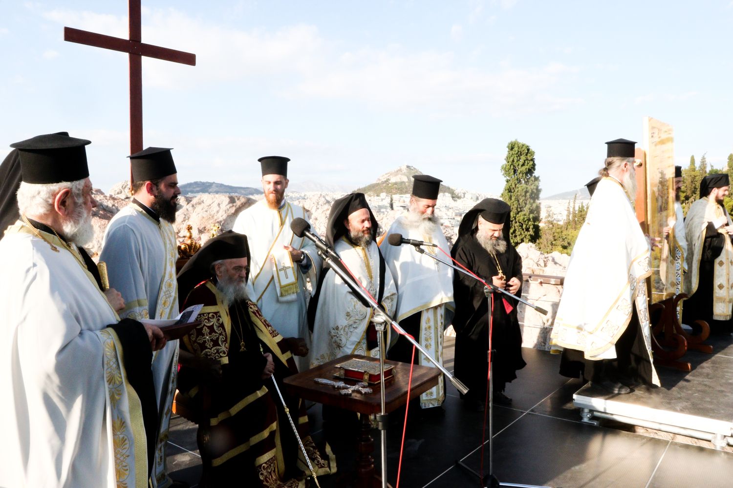 Στον χωρο του Αρειου Παγου των Αρχαιων Αθηνων στην Πνυκα οπου ο Αποστολος Παυλος μιλησε στους Αθηναίους τελέστηκε σημερα ο καθιερωμενος εσπερινος επι της εορτης του Αποστολου Παυλου χοροστατουντος του Μητροπολιτη Ναυπακτου Ιεροθεου και παρουσια τη υπ.Παιδειας Σοφιας Ζαχαρακη,του Αντιπροεδρου της Βουλης Θαναση Μπουρα . του εκπροσωπου του ΠΑΣΟΚ Παυλου Χρηστιδη, του Δημαρχου Αθηναιων Χαρη Δουκα, εκπροσωπων του Οικουμενικου Πατριαρχειου και του Πατριαρχειου Ιεροσολυμων του αρχηγου ΓΕΕΘΑ εκπροσωπων της Περιφερειας Αττικης, των Στρατιωτικων Επιτελειων , εκπροσωπων ξενων θρησκευτικων δογματων, του Καθολικου Αρχιεπισκοπου Αθηνων και αρκετων Μητροπολιτων της Ελλαδικης Εκκλησιας --Στη φωτο ΦΩΤΟ ΧΡΗΣΤΟΣ ΜΠΟΝΗΣ//ΙΕΡΑ ΣΥΝΟΔΟΣ