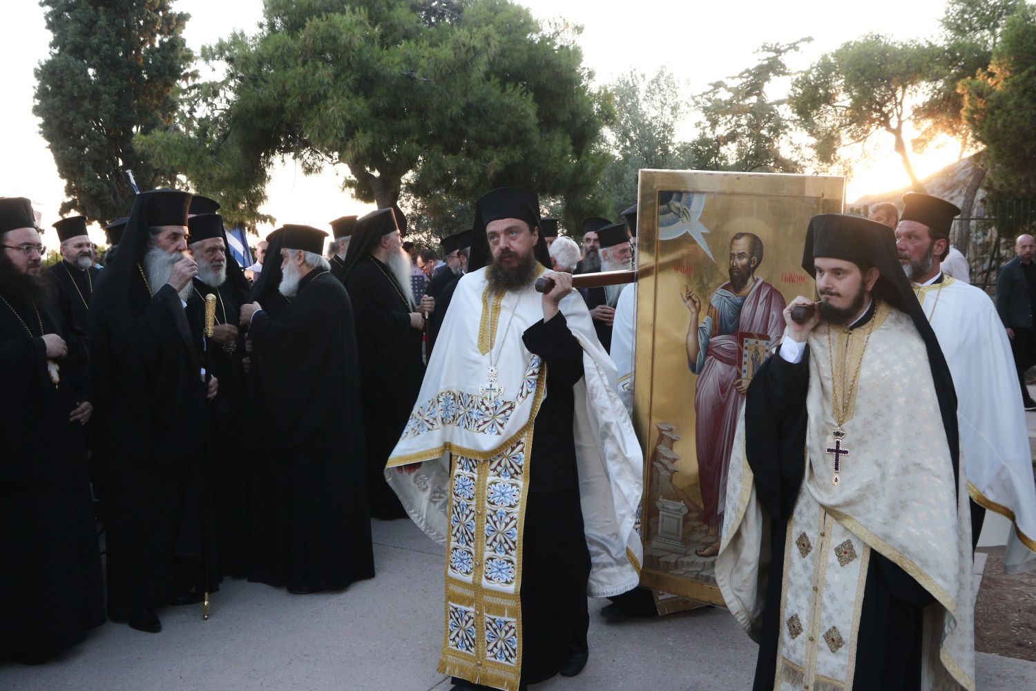 Μέγας Πανηγυρικός Εσπερινός σε ανάμνηση του κηρύγματος του Αποστόλου των Εθνών Παύλου προς τους Αθηναίους τελέστηκε νωρίς το βράδυ της Κυριακής στον ιερό βράχο του Αρείου Πάγου.