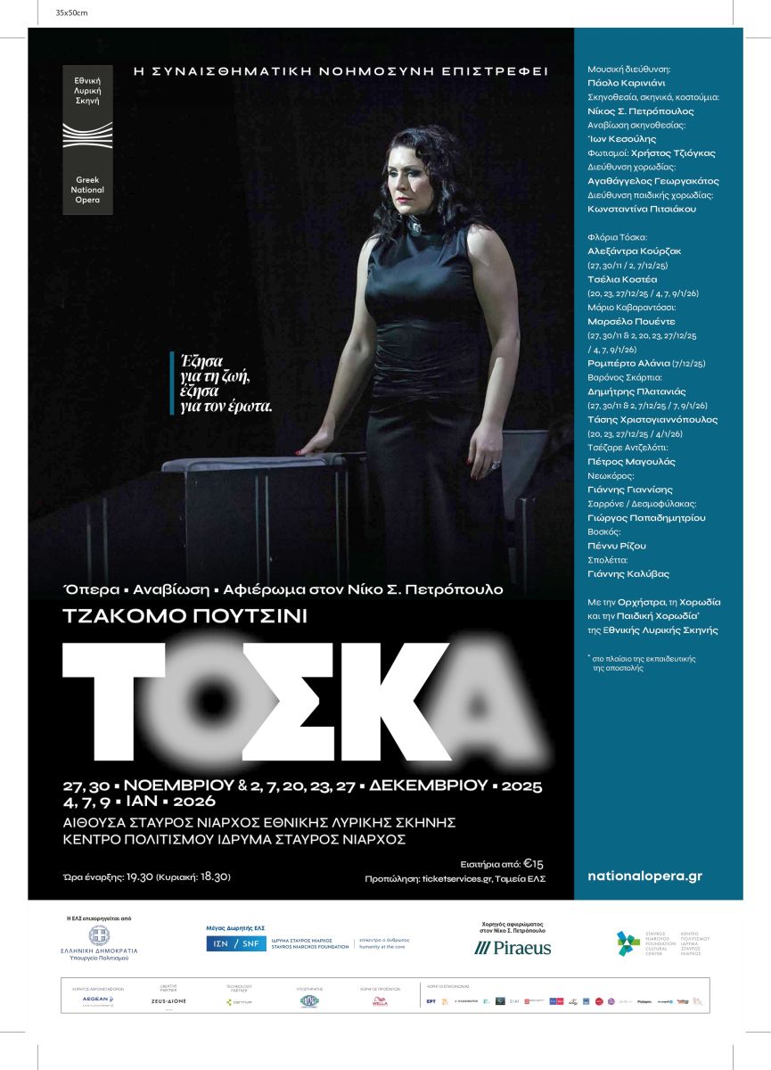 Η Πειραιώς χορηγός του αφιερώματος στον Νίκο Σ. Πετρόπουλο και της όπερας «Τόσκα» στην Εθνική Λυρική Σκηνή