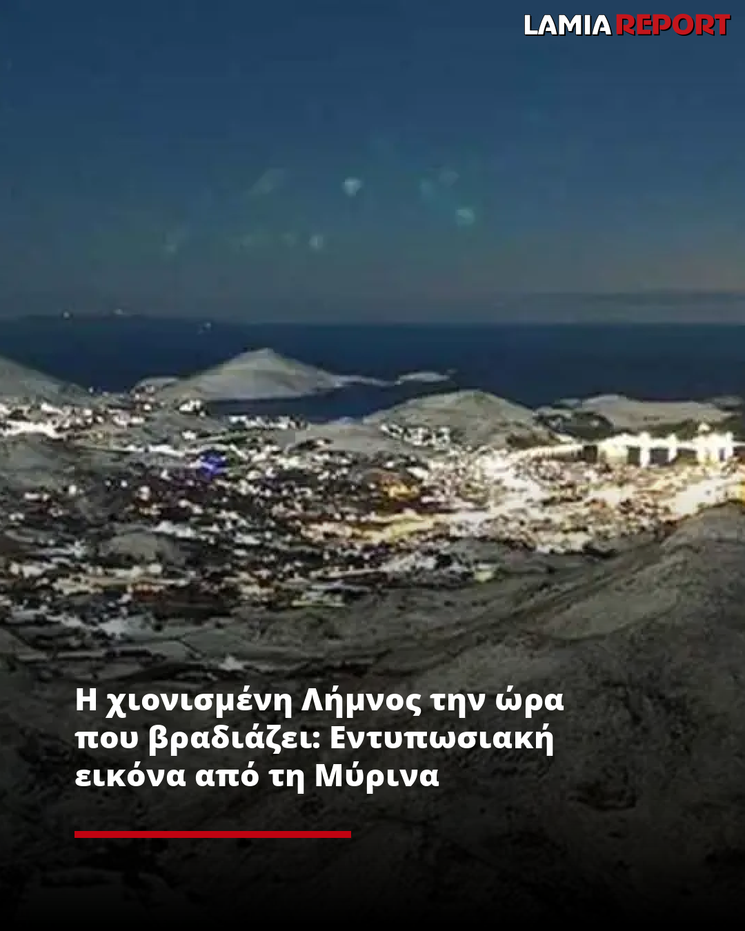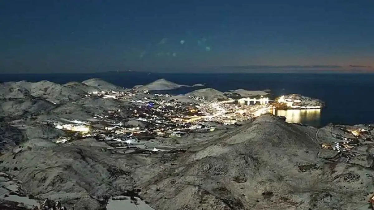 Τα φώτα της Μύρινας ξεχωρίζουν μέσα στο λευκό τοπίο