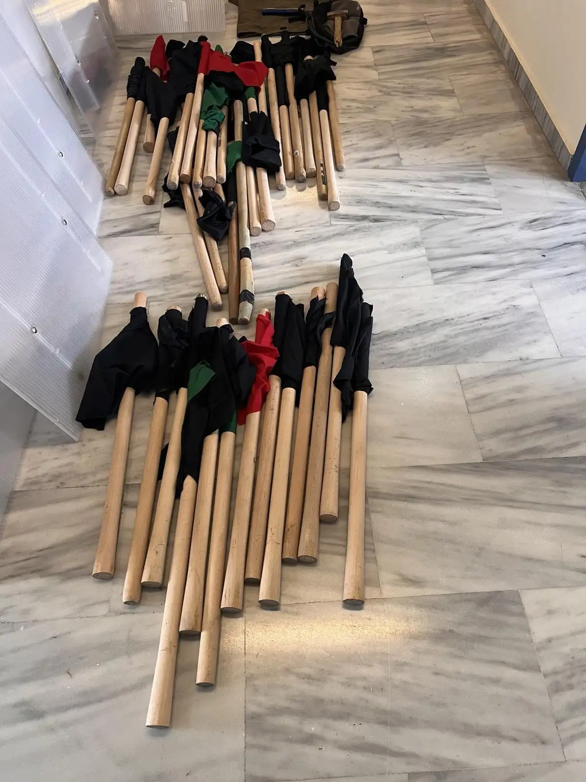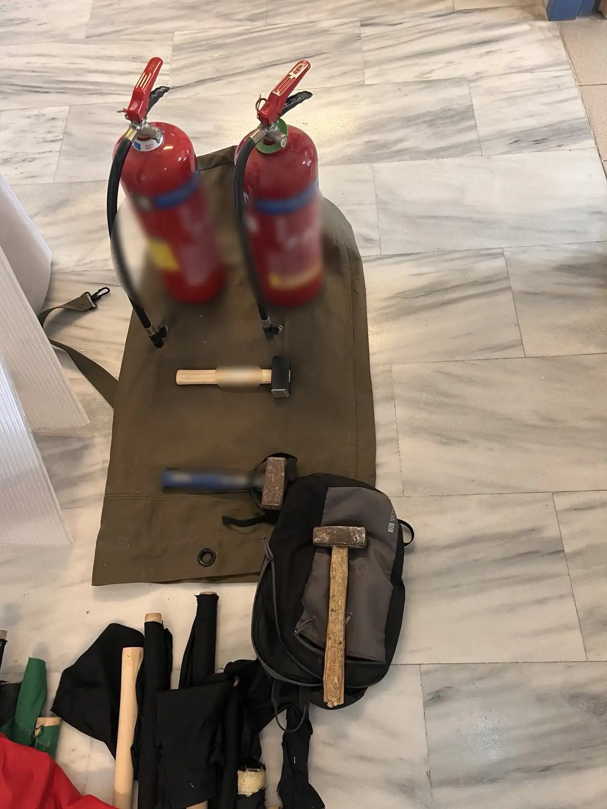 Κατά την έρευνα που έγινε στον χώρο, όπως αναφέρει το newsit.gr, βρέθηκαν σφυριά, καδρόνια, μάσκες, πλακάτ, αντιασφυξιογόνες μάσκες και κράνη.
