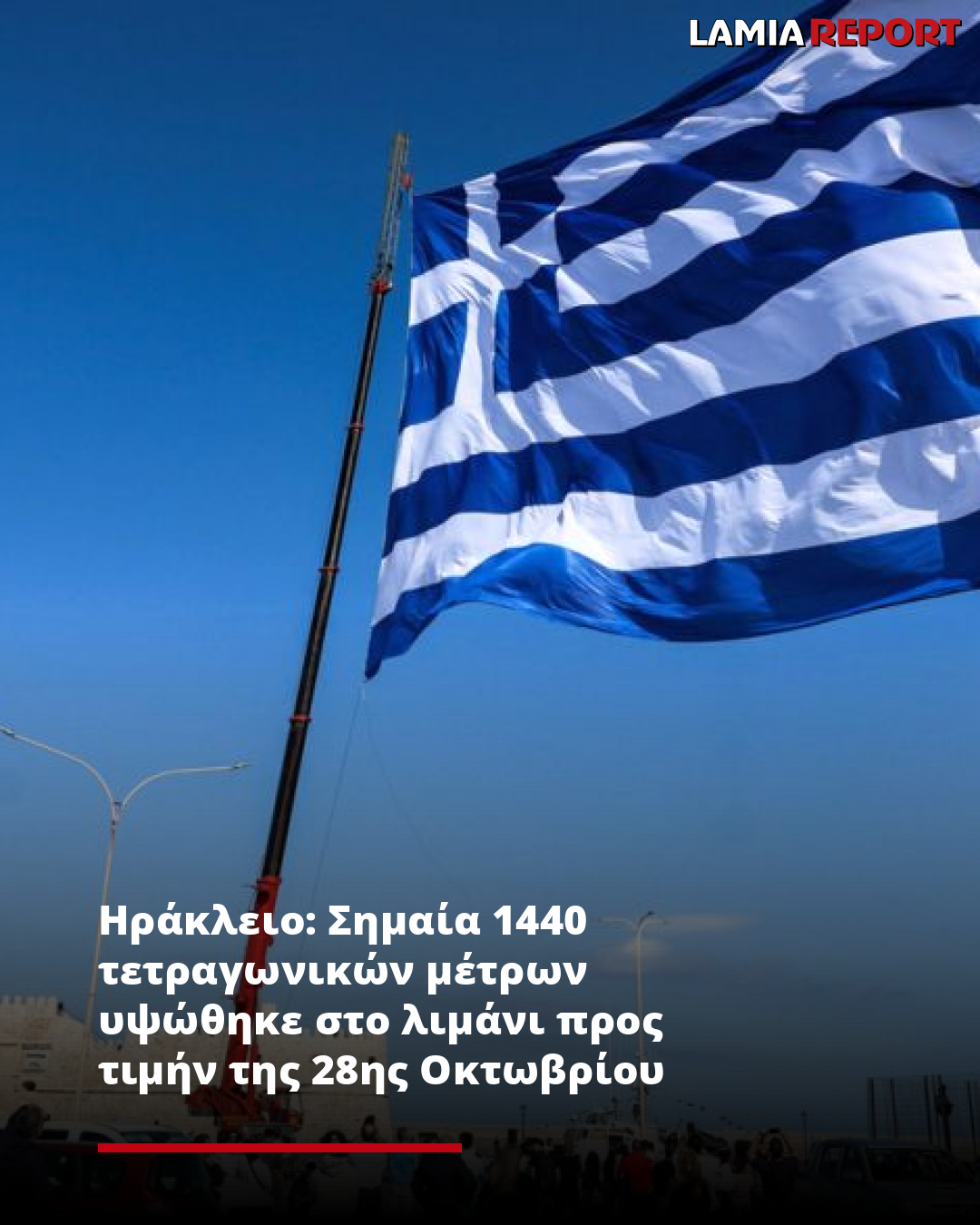 Όπως κάθε χρόνο τα τελευταία χρόνια, έτσι και φέτος στο λιμάνι του Ηρακλείου στην Κρήτη, ανήμερα της 28ης Οκτωβρίου, υψώθηκε η εντυπωσιακή ελληνική σημαία των 1440 τετραγωνικών μέτρων.