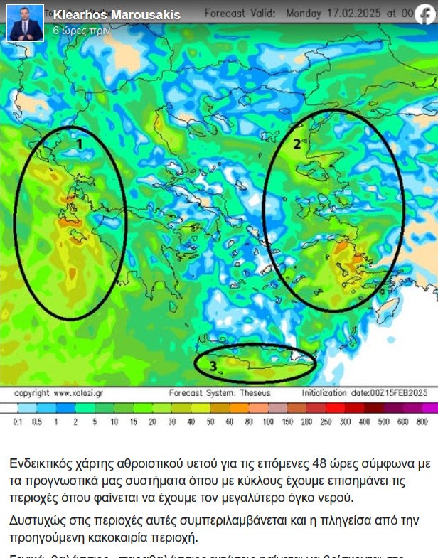 β. Από τις πρώτες πρωινές ώρες της Κυριακής (16-02-2025) στην ανατολική Πελοπόννησο και πρόσκαιρα στη δυτική και νότια Κρήτη, τις Κυκλάδες και το βορειοανατολικό Αιγαίο.