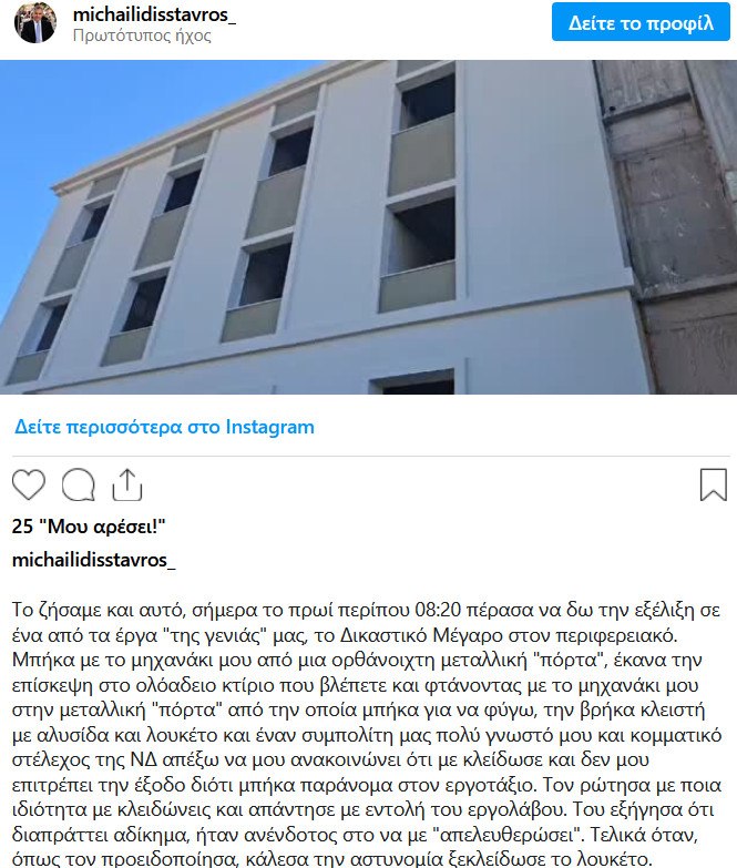 Ο Σταύρος Μιχαηλίδης με ανάρτησή του στο instagram αναφέρει ότι κατά τη διάρκεια αυτοψίας στο υπό κατασκευή Δικαστικό Μέγαρο, παγιδεύτηκε εντός του εργοταξίου κατηγορώντας κομματικό στέλεχος της ΝΔ που είναι και υπεύθυνος για το εργοτάξιο, ότι του έκλεισε την έξοδο με λουκέτο.