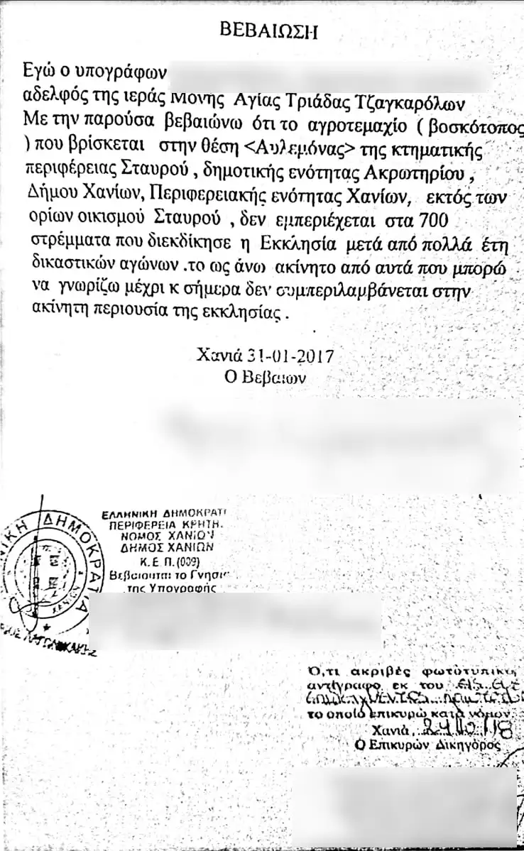 Πρόκειται για τη βεβαίωση που τους χορήγησε το 2017 ο κατηγορούμενος αρχιμανδριτης και ανέφερε πως τα 175 στρέμματα δεν ανήκουν στην Ιερά Μονή. Μαλιστα ο ένας αδελφός είναι βέβαιος ότι το συγκεκριμένο έγγραφο -ο οποίος μάλιστα ο ίδιος εδωσε στην εκκλησία σε αντίγραφο- αποτελεί το ισχυρότερο όπλο στη φαρέτρα του!