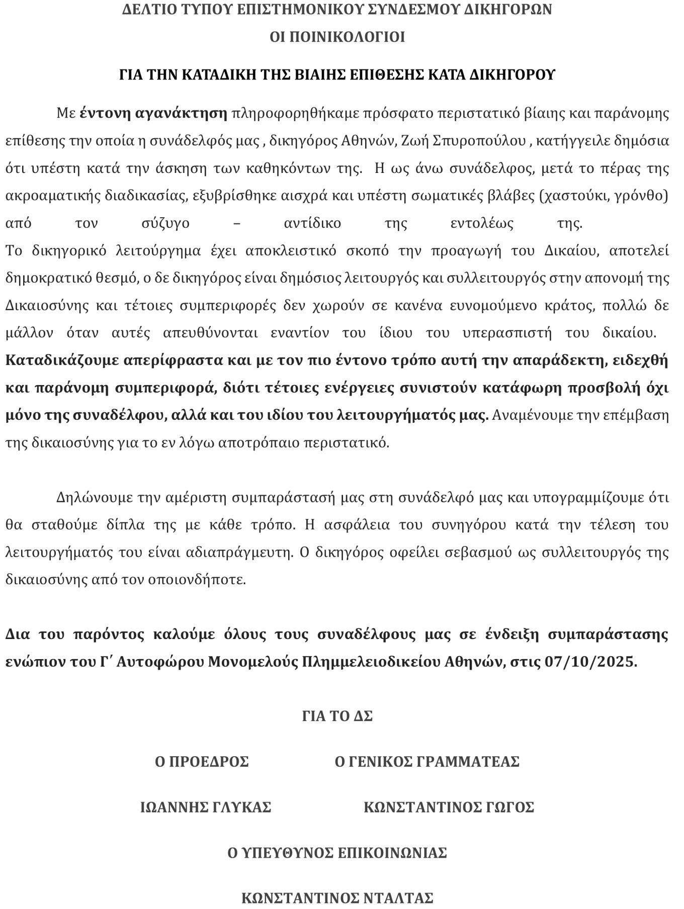 «Η άσκηση σωματικής βίας και απειλής κατά γυναίκας δικηγόρου την ώρα που ασκεί το ιερό καθήκον του δικηγορικού λειτουργήματος αποτελεί τη χειρότερη μορφή παραβίασης θεμελιωδών συνταγματικών δικαιωμάτων και ελευθεριών», αναφέρεται στην κοινή ανακοίνωση που ανάρτησε ο ποινικολόγος Θέμης Σοφός. Παράλληλα εκφράζεται απογοήτευση για την περιορισμένη αντίδραση του προέδρου του Δ.Σ.Α., καθώς - όπως τονίζεται - «τέτοιου είδους τυπικά σημειώματα δίνουν θάρρος σε κάθε βίαιο χαρακτήρα να επαναλάβει τέτοιες πράξεις».