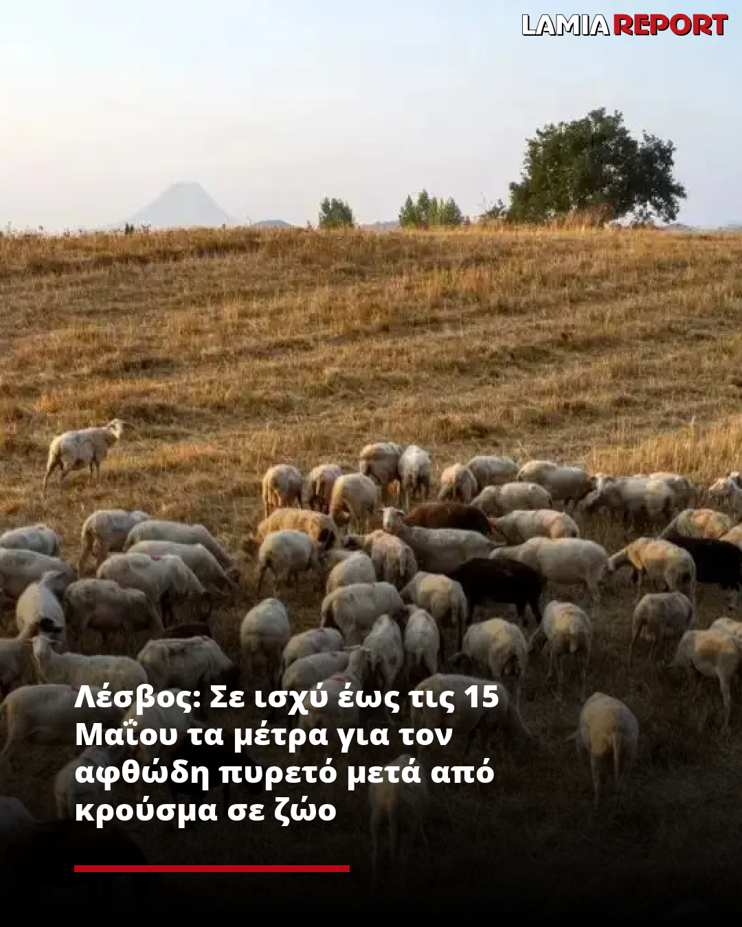 Έκτακτα μέτρα από το Υπουργείο Αγροτικής Ανάπτυξης και Τροφίμων στη Λέσβο μετά την επιβεβαίωση κρούσματος αφθώδους πυρετού, με ζώνες προστασίας, απαγόρευση μετακίνησης ζώων και περιορισμούς σε γάλα, κρέας και ζωικά προϊόντα έως τουλάχιστον τις 15 Μαΐου.