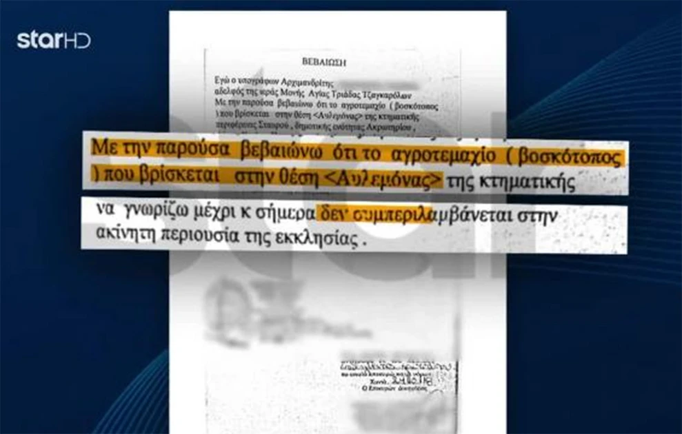 Το έγγραφο που αποκάλυψε το Star, φέρει τη βεβαίωση του Αρχιμανδρίτη -απότελεσμα εκβιασμού- και αναφέρει: «Βεβαιώνω ότι το αγροτεμάχιο στη θέση Αυλέμονας δεν ανήκει στην περιουσία της Εκκλησίας».