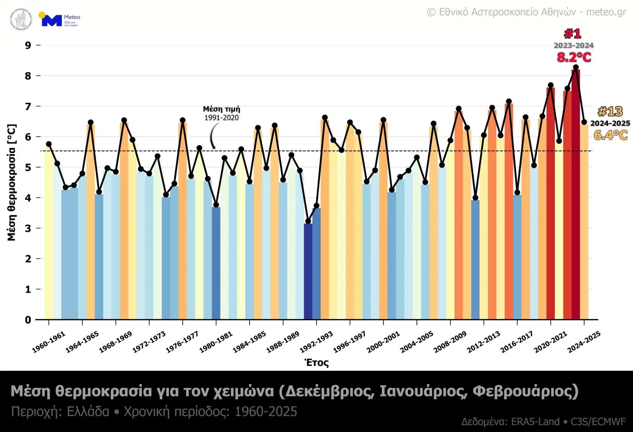 Μέση θερμοκρασία για την περίοδο του χειμώνα (Δεκέμβριος, Ιανουάριος, Φεβρουάριος) στην Ελλάδα από το 1960 μέχρι και το 2025