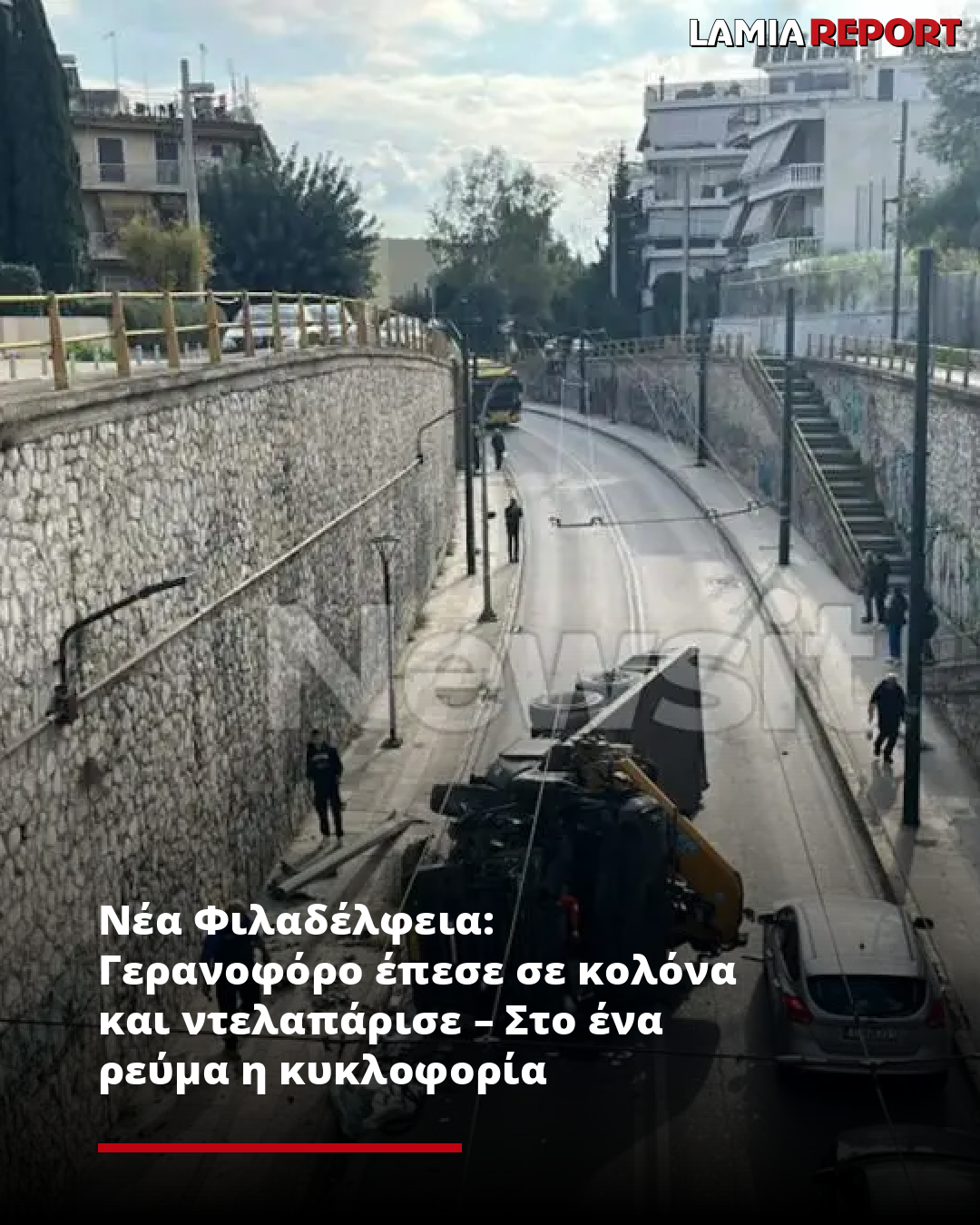 Το τροχαίο στη Νέα Φιλαδέλφεια έγινε όταν ένα γερανοφόρο όχημα έπεσε πάνω σε κολόνα και ντελαπάρισε, σύμφωνα με το newsit.gr.