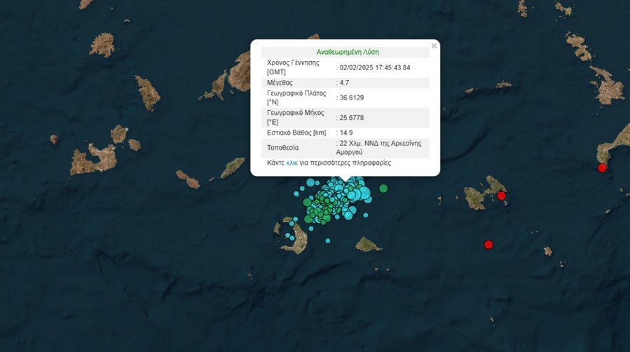 Νέοι ισχυροί σεισμοί 4,7 και 4,5 ρίχτερ εκδηλώθηκαν στην περιοχή, με το επίκεντρο να εντοπίζεται 22 Χλμ. Νότια Νοτιοδυτικά της Αρκεσίνης Αμοργού, σύμφωνα με την αναθεωρημένη λύση του Γεωδυναμικού Ινστιτούτου.