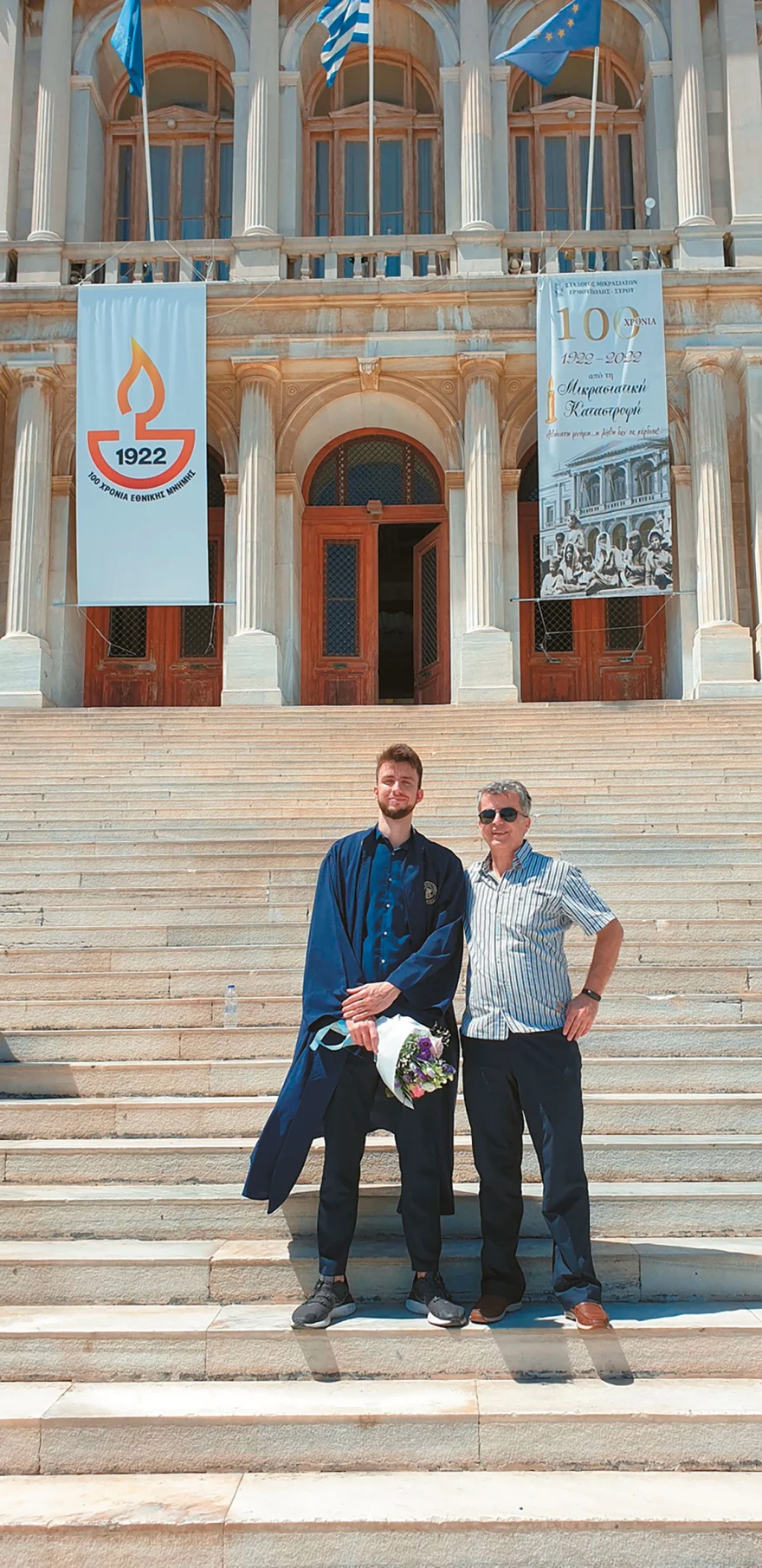 Ο 27χρονος Νίκος Γκάτσης με τον πατέρα του Αρη μετά την τελετή αποφοίτησης από το τμήμα Μηχανικών Σχεδιασμού Συστημάτων του Παν. Αιγαίου, στη Σύρο