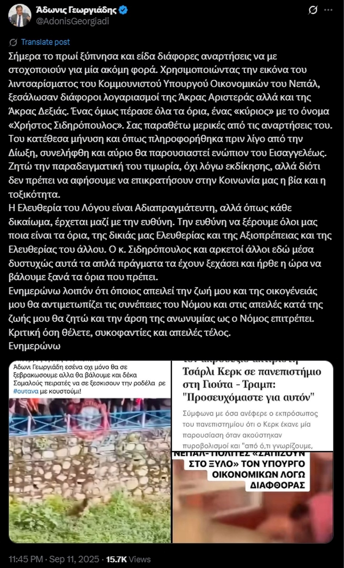 Σήμερα το πρωί ξύπνησα και είδα διάφορες αναρτήσεις να με στοχοποιούν για μία ακόμη φορά. Χρησιμοποιώντας την εικόνα του λιντσαρίσματος του Κομμουνιστού Υπουργού Οικονομικών του Νεπάλ, ξεσάλωσαν διάφοροι λογαριασμοί της Άκρας Αριστεράς αλλά και της Άκρας Δεξιάς. Ένας όμως πέρασε όλα τα όρια, ένας "κύριος" με το όνομα "Χρήστος Σιδηρόπουλος". Σας παραθέτω μερικές από τις αναρτήσεις του. Του κατέθεσα μήνυση και όπως πληροφορήθηκα πριν λίγο από την Δίωξη, συνελήφθη και αύριο θα παρουσιαστεί ενώπιον του Εισαγγελέως. Ζητώ την παραδειγματική του τιμωρία, όχι λόγω εκδίκησης, αλλά διότι δεν πρέπει να αφήσουμε να επικρατήσουν στην Κοινωνία μας η βία και η τοξικότητα. Η Ελευθερία του Λόγου είναι Αδιαπραγμάτευτη, αλλά όπως κάθε δικαίωμα, έρχεται μαζί με την ευθύνη. Την ευθύνη να ξέρουμε όλοι μας ποια είναι τα όρια, της δικιάς μας Ελευθερίας και της Αξιοπρέπειας και της Ελευθερίας του άλλου. Ο κ. Σιδηρόπουλος και αρκετοί άλλοι εδώ μέσα δυστυχώς αυτά τα απλά πράγματα τα έχουν ξεχάσει και ήρθε η ώρα να βάλουμε ξανά τα όρια που πρέπει. Ενημερώνω λοιπόν ότι όποιος απειλεί την ζωή μου και της οικογένειάς μου θα αντιμετωπίζει τις συνέπειες του Νόμου και στις απειλές κατά της ζωής μου θα ζητώ και την άρση της ανωνυμίας ως ο Νόμος επιτρέπει.