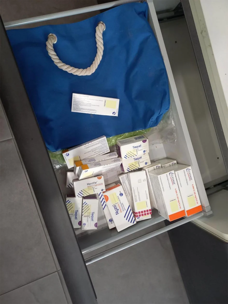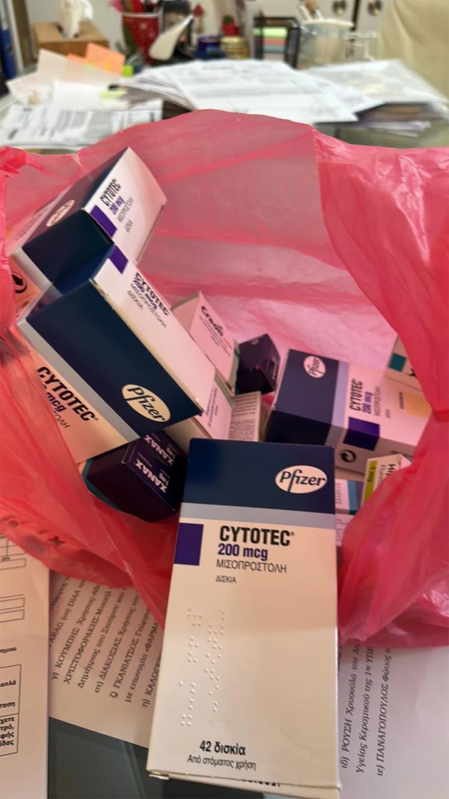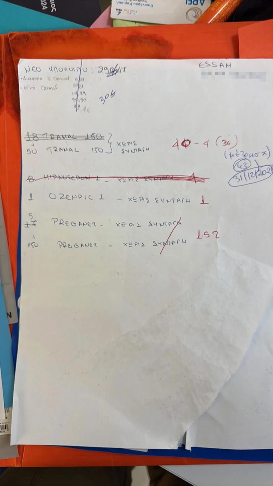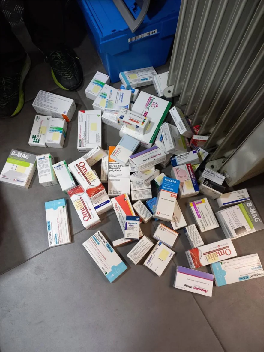 Ανάμεσα στα ευρήματα ξεχωρίζει το πλήθος φαρμάκων που κατασχέθηκε καθώς και έγγραφα στα οποία αναγράφονται φάρμακα, ημερομηνίες και δίπλα οι λέξεις: «χωρίς συνταγή».