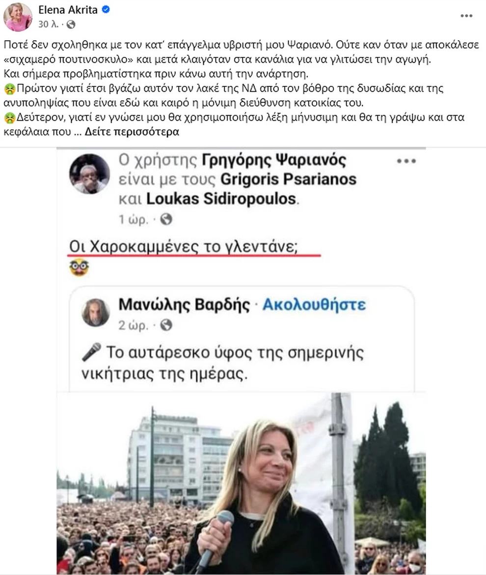 Γράφει η Έλενα Ακρίτα: «Ποτέ δεν σχοληθηκα με τον κατ’ επάγγελμα υβριστή μου Ψαριανό. Ούτε καν όταν με αποκάλεσε «σιχαμερό πουτινοσκυλο» και μετά κλαιγόταν στα κανάλια για να γλιτώσει την αγωγή.