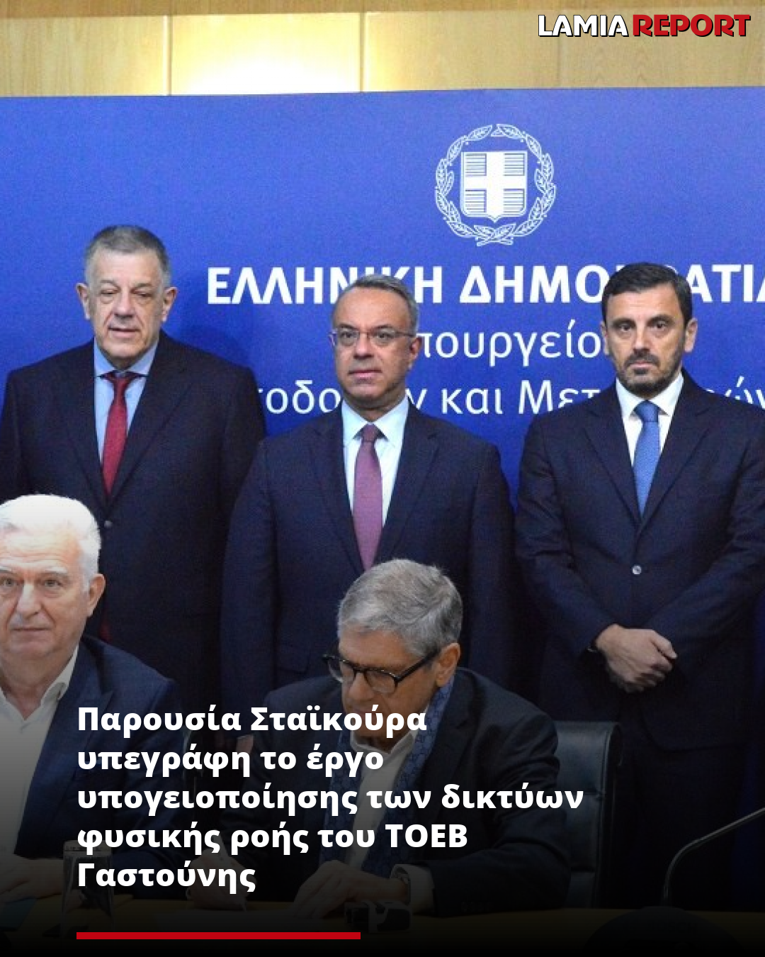 Υπεγράφη, σήμερα, στο Υπουργείο Υποδομών και Μεταφορών η σύμβαση για τα έργο «Υπογειοποίηση δικτύων φυσικής ροής (καναλέτων) ΤΟΕΒ Γαστούνης», παρουσία του Υπουργού Υποδομών και Μεταφορών Χρήστου Σταϊκούρα, του Υφυπουργού Υποδομών και Μεταφορών, αρμόδιου για τις Υποδομές Νίκου Ταχιάου και του Γενικού Γραμματέα Υποδομών Κωνσταντίνου Μαγουλά.