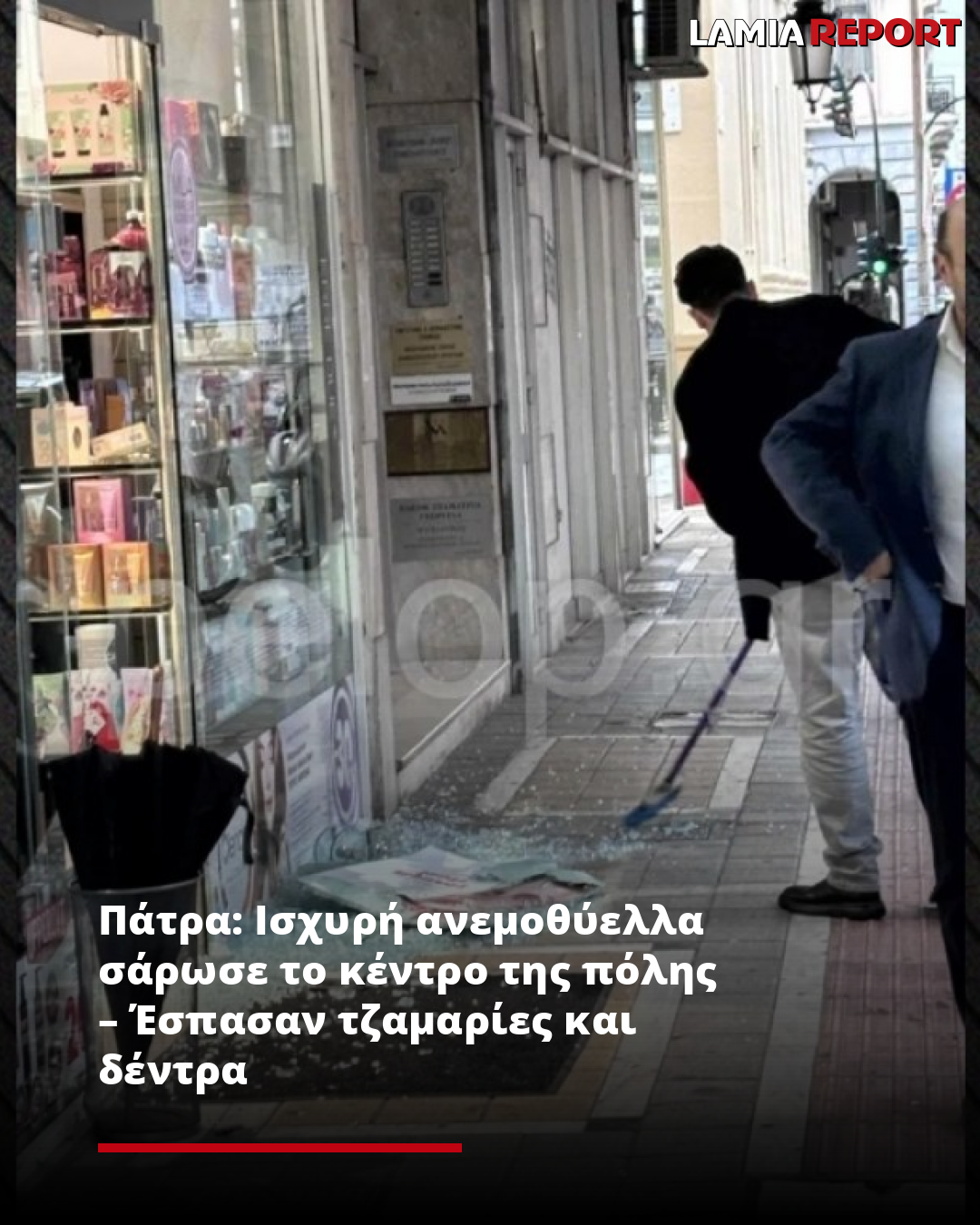 Σύμφωνα με το pelop.gr, οι δυνατοί άνεμοι έσπασαν τζαμαρίες καταστημάτων, ενώ κομμάτια γυαλιού σκορπίστηκαν στους δρόμους.