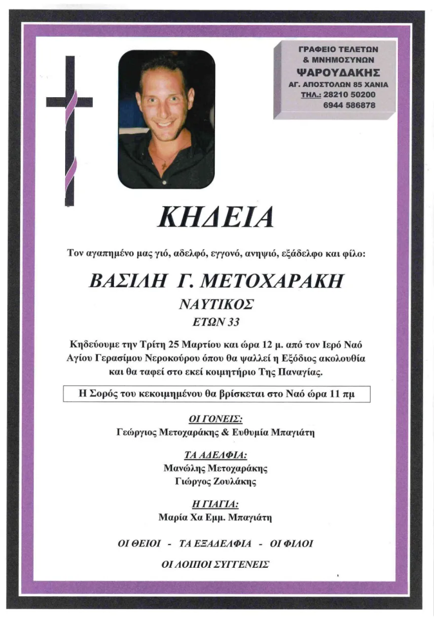 Ο 33χρονος Βασίλης Μετοχαράκης, με καταγωγή από τα Χανιά, εντοπίστηκε νεκρός από ένα μέλος του πληρώματος στο πλοίο όπου εργαζόταν
