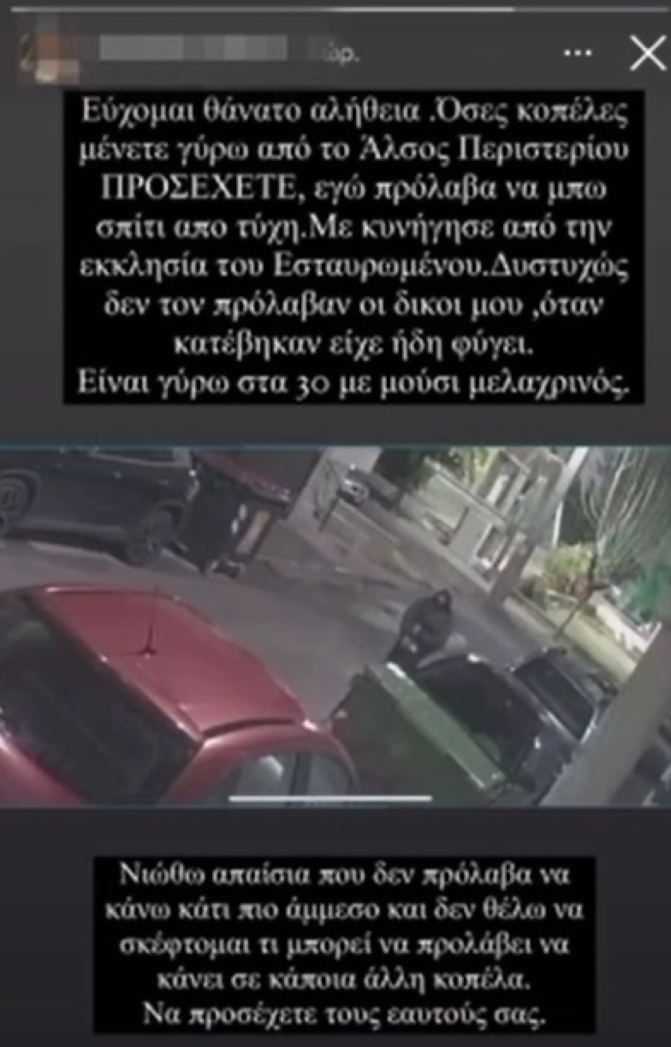 Η αγωνία της αποτυπώνεται έντονα στην ανάρτησή της στο Instagram , όπου, συνοδεύοντας τα λόγια της με το επίμαχο βίντεο από κάμερα ασφαλείας, περιγράφει τις εφιαλτικές στιγμές που έζησε. «Με κυνήγησε από την εκκλησία του Εσταυρωμένου. Δυστυχώς, όταν κατέβηκαν οι δικοί μου, είχε ήδη φύγει. Είναι γύρω στα 30, με μούσι, μελαχρινός» έγραψε χαρακτηριστικά, προσπαθώντας παράλληλα να προειδοποιήσει τις γυναίκες που κινούνται στην περιοχή να είναι ιδιαίτερα προσεκτικές.