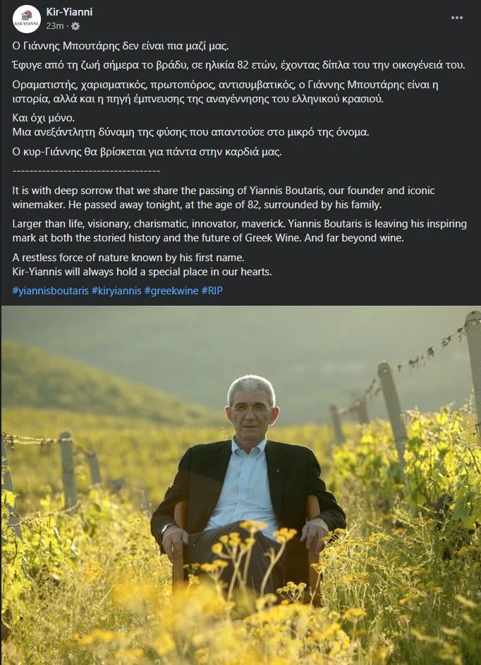 «Οραματιστής, χαρισματικός, πρωτοπόρος, αντισυμβατικός, ο Γιάννης Μπουτάρης είναι η ιστορία, αλλά και η πηγή έμπνευσης της αναγέννησης του ελληνικού κρασιού. Και όχι μόνο. Μια ανεξάντλητη δύναμη της φύσης που απαντούσε στο μικρό της όνομα. Ο κυρ-Γιάννης θα βρίσκεται για πάντα στην καρδιά μας», συμπληρώνεται στην ίδια ανάρτηση.